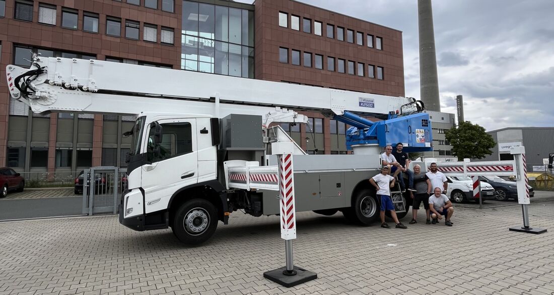 Der K2500 Autokran hebt bis zu drei Tonnen und bietet eine Hakenhöhe von 58 Metern und eine Ausfahrlänge von 59 Metern. Der Neuzugang wurde mit verschiedenen Anbauteilen bestellt, darunter dem beliebten Dachdeckerkorb.