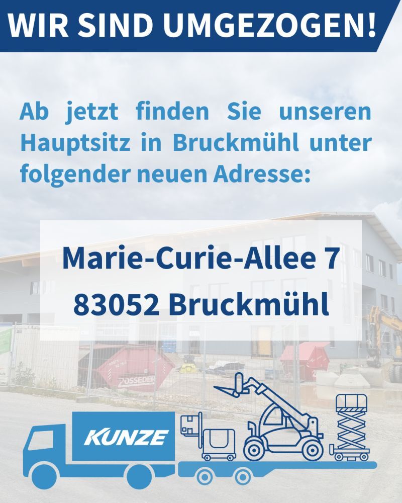 Umzug geschafft: Die Firmengruppe Kunze ist umgezogen und seit Montag auf dem neuen Firmengelände in Bruckmühl zuhause. Der neue Standort in der Marie-Curie-Allee bietet mehr als 7.000 Quadratmeter Fläche, eine gut ausgestattete Werkstatt mit Deckenkran, Ersatzteilelogistik, Schulungszentrum und einen großen Miet-, Neu- und Gebrauchtgerätebestand.