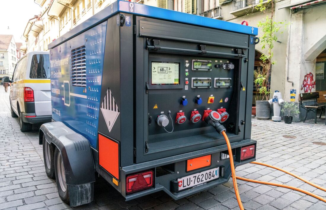Der Kran, der mit einem 400-kW-Dieselmotor ausgestattet ist, kann für seine Hubarbeiten ebenso auf Baustellenstrom oder adäquate mobile 63-Ampere-Stromquellen zurückgreifen. Auf der Baustelle in Bern stand dafür ein mobiler Liduro Power Port LPO 100 bereit, ein von Liebherr angefertigter Batterieanhänger. Voll aufgeladen, reicht die gespeicherte Energie nach Angaben von Liebherr für zwei Tage Kranarbeit.