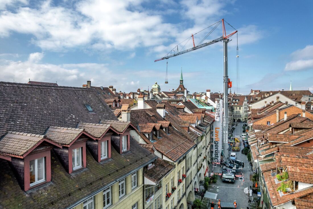 Für den Einsatz rückte das Team von Zaugg am frühen Morgen mit dem Kranfahrzeug in die Berner Innenstadt ein. „Die Allradlenkung ermöglicht uns hier ein problemloses Manövrieren in den engen Gassen“, so Stettler. Im Rückwärtsgang manövrierte sich der Kran durch die historische Rathausgasse – vorbei an den typischen Laubengängen, die das Bild der Berner Altstadt prägen.