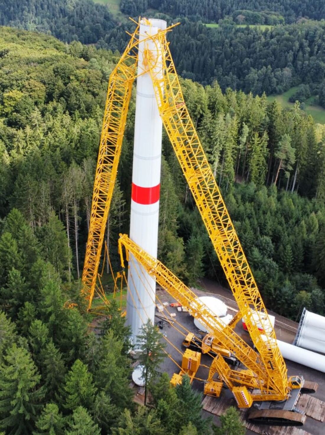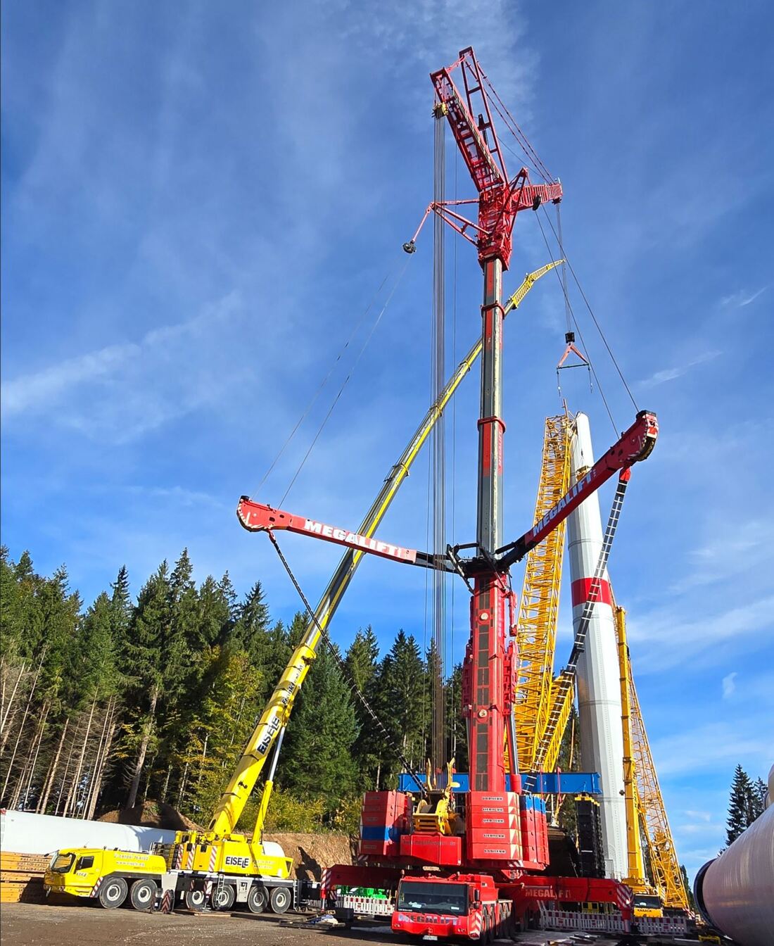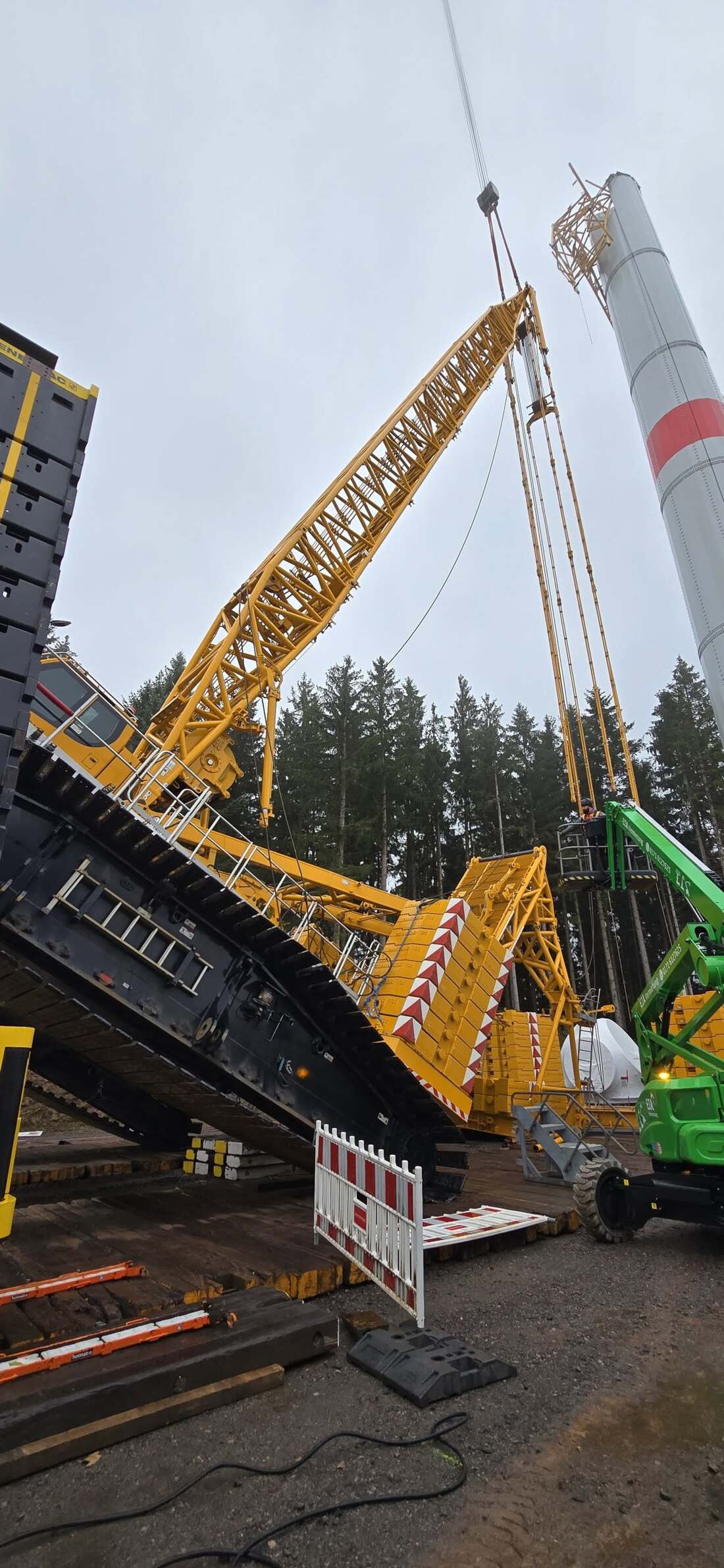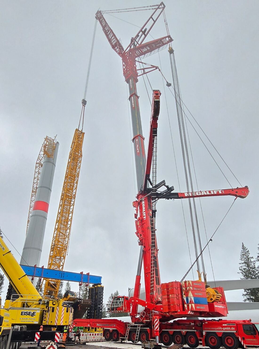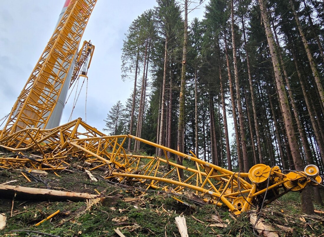 Baustelle des E-Werk Mittelbaden: Durch starke Windböen war der LR 1700 Ende August auf der Windkraft-Baustelle der Prechtaler Schanze zwischen Gutach und Mühlenbach in der Ortenau nach hinten umgestürzt. Dabei schlug der Gittermastausleger auf den teilweise errichteten Turm einer im Bau befindlichen Windkraftanlage (WKA) auf und knickte in rund 80 Metern Höhe ab. Der Turm selbst misst 76 Meter. Der LR 1700 war zum Unfallzeitpunkt mit einer Systemlänge von 162 Metern aufgebaut.