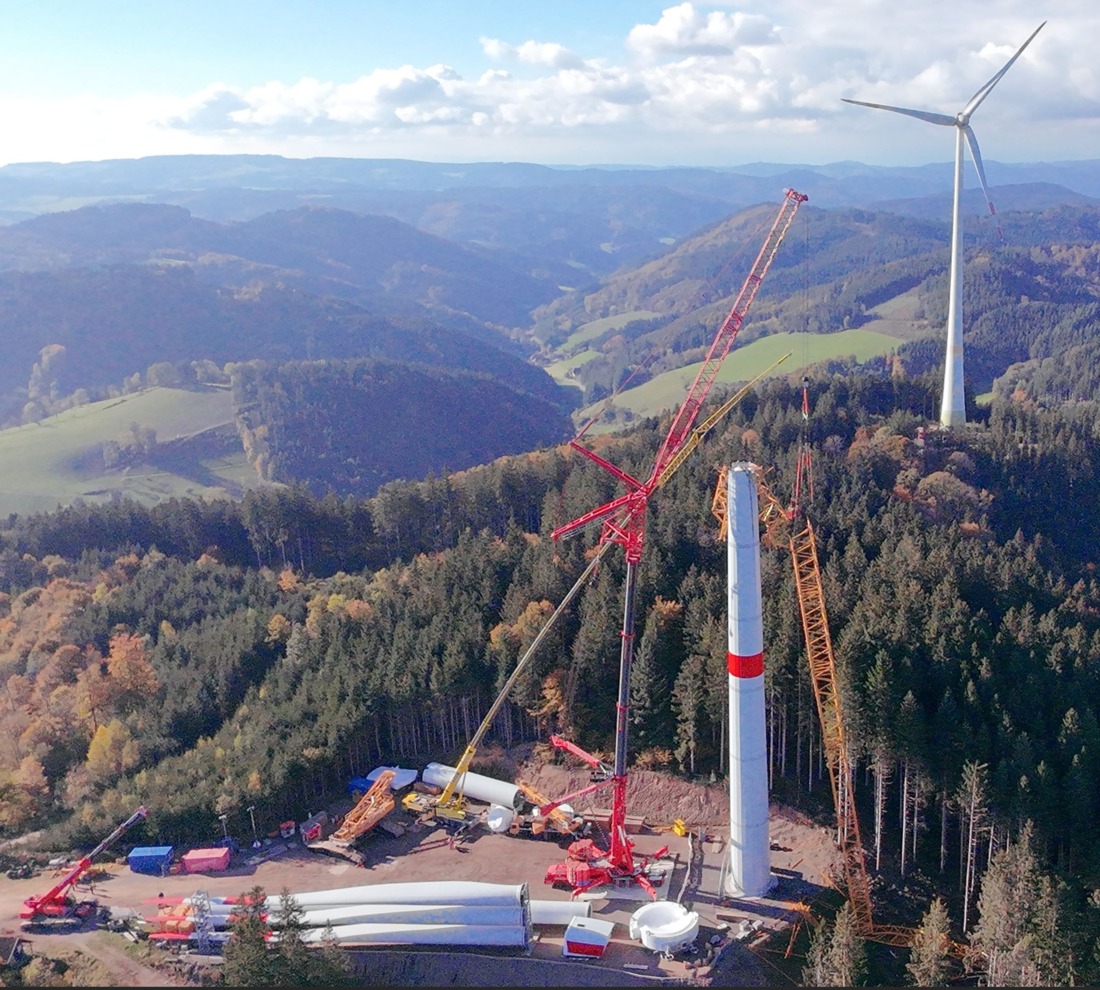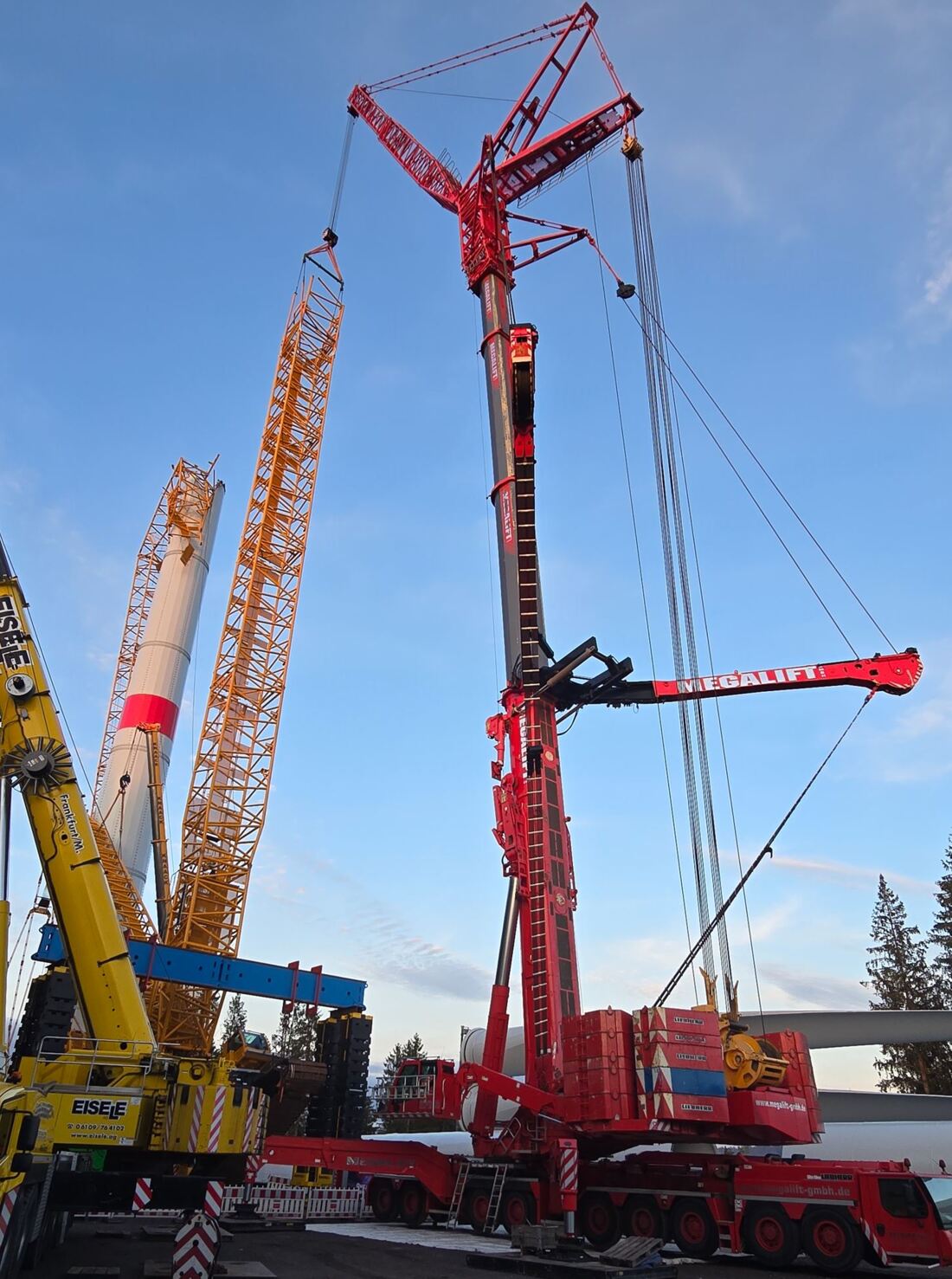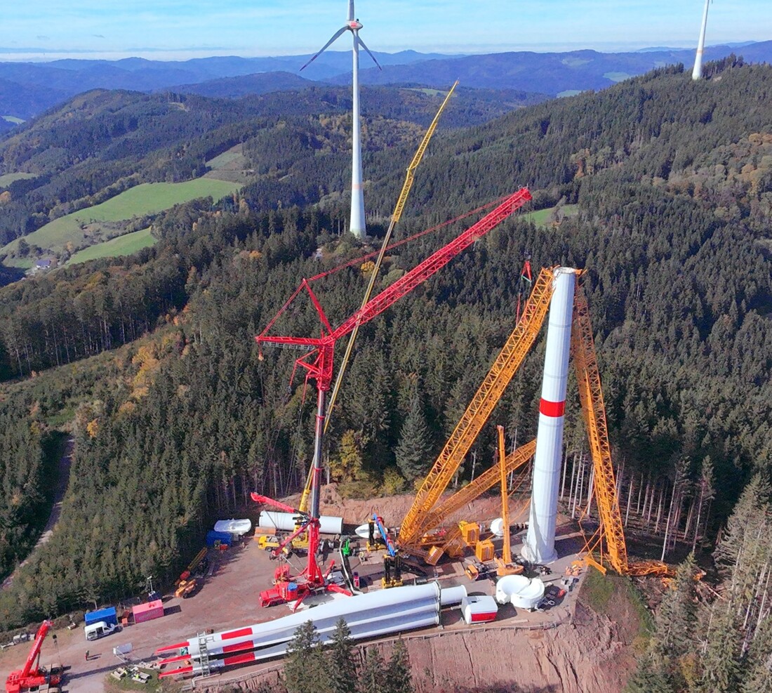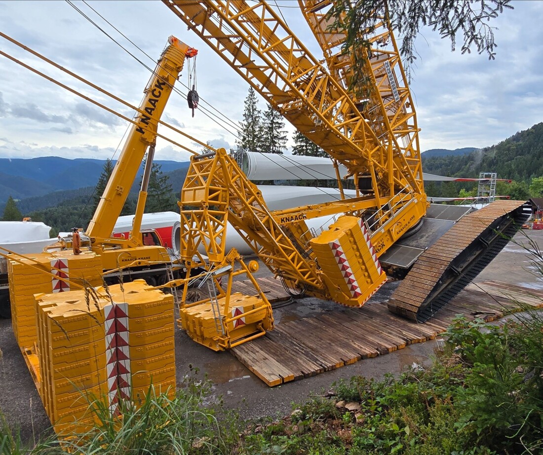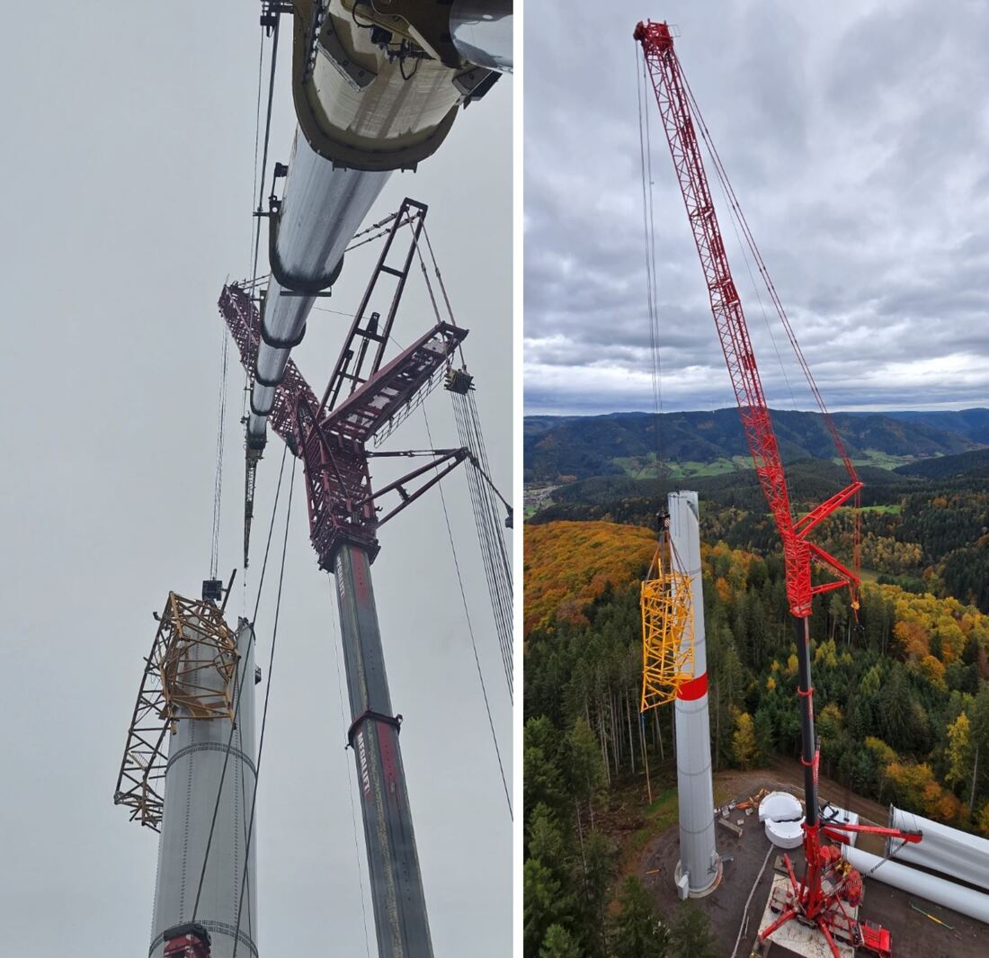Baustelle des E-Werk Mittelbaden: Durch starke Windböen war der LR 1700 Ende August auf der Windkraft-Baustelle der Prechtaler Schanze zwischen Gutach und Mühlenbach in der Ortenau nach hinten umgestürzt. Dabei schlug der Gittermastausleger auf den teilweise errichteten Turm einer im Bau befindlichen Windkraftanlage (WKA) auf und knickte in rund 80 Metern Höhe ab. Der Turm selbst misst 76 Meter. Der LR 1700 war zum Unfallzeitpunkt mit einer Systemlänge von 162 Metern aufgebaut.