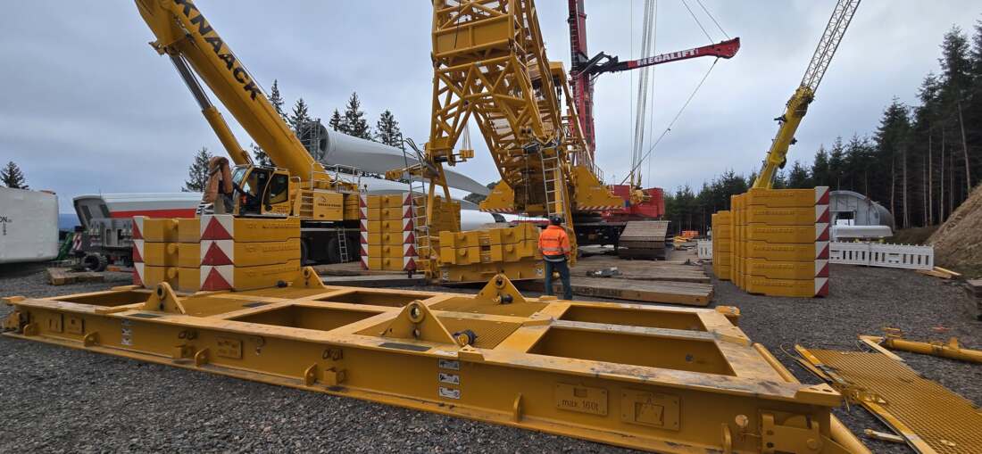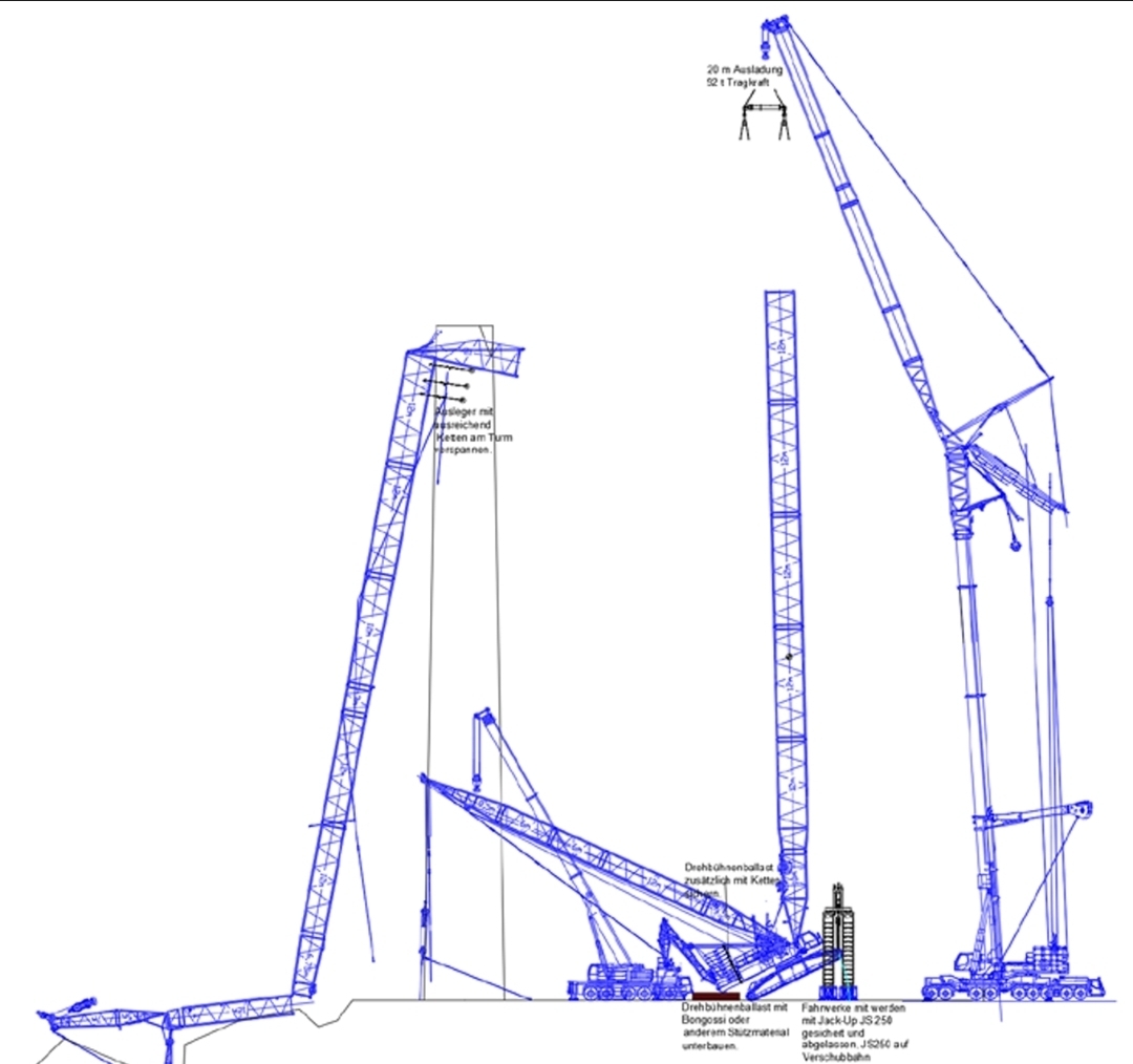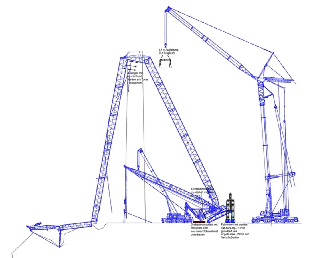 • Der Ausleger lag auf dem WKA-Turm auf; der A-Bock war in den V-Frame gedrückt, welcher sich wiederum auf der Ballastpalette abstützte.
