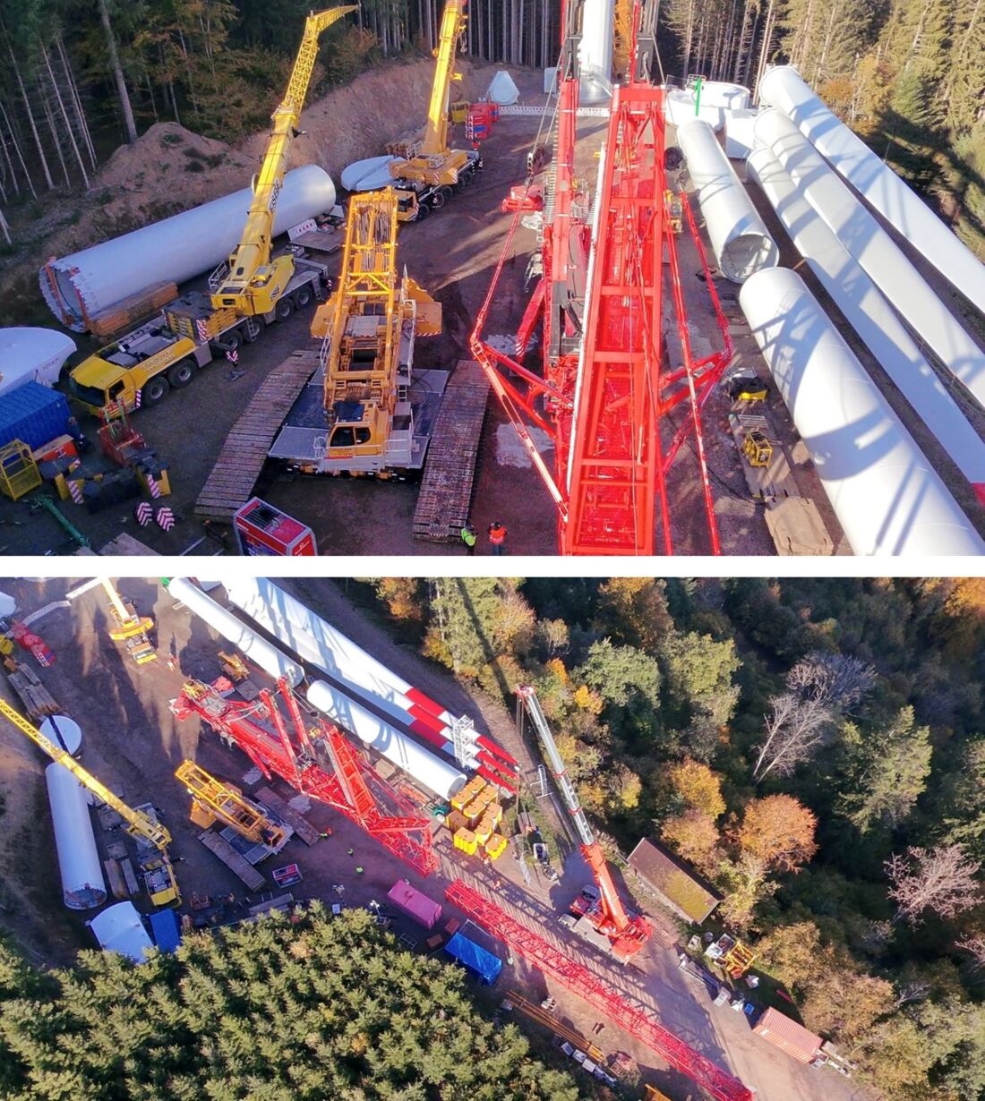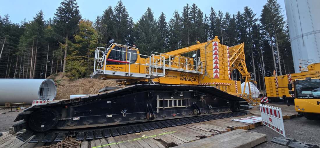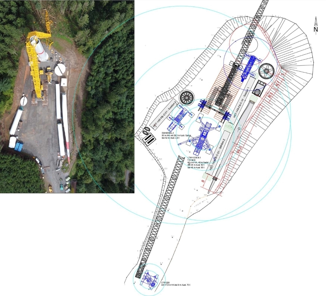 Die Baustelle war stark eingeengt – bereits angelieferte WKA-Komponenten erschwerten die Bewegungsfreiheit erheblich. Gleichzeitig durfte der hintere Baustellenbereich nur im Ausnahmefall und mit Sicherheitsposten betreten werden. Das erforderliche Berge-Equipment musste daher vollständig im vorderen Baustellenbereich positioniert werden. Die Hanglage erschwerte die Arbeiten zusätzlich und schloss jegliche Bergemaßnahmen im rückwärtigen Gelände aus.