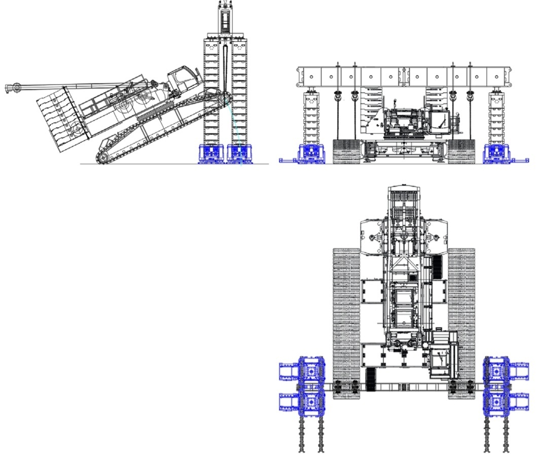 Sicherung des Grundgeräts: Zunächst wurde das Jackup-System auf einer Verschubbahn aufgebaut und mit einem Querträger ergänzt. Damit konnten die vorderen Enden der Fahrwerke gegen weiteres Zurückfallen gesichert werden. Beim späteren kontrollierten Absenken auf den Boden wurde die notwendige kreisförmige Absetzkurve durch Verschieben auf der Bahn präzise mitgeführt.