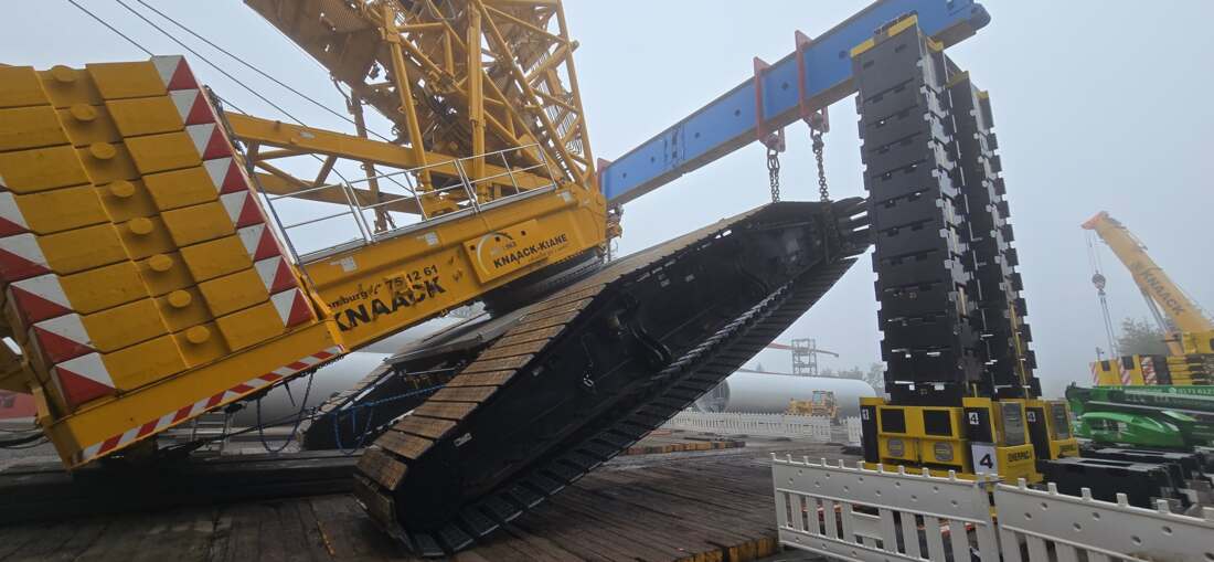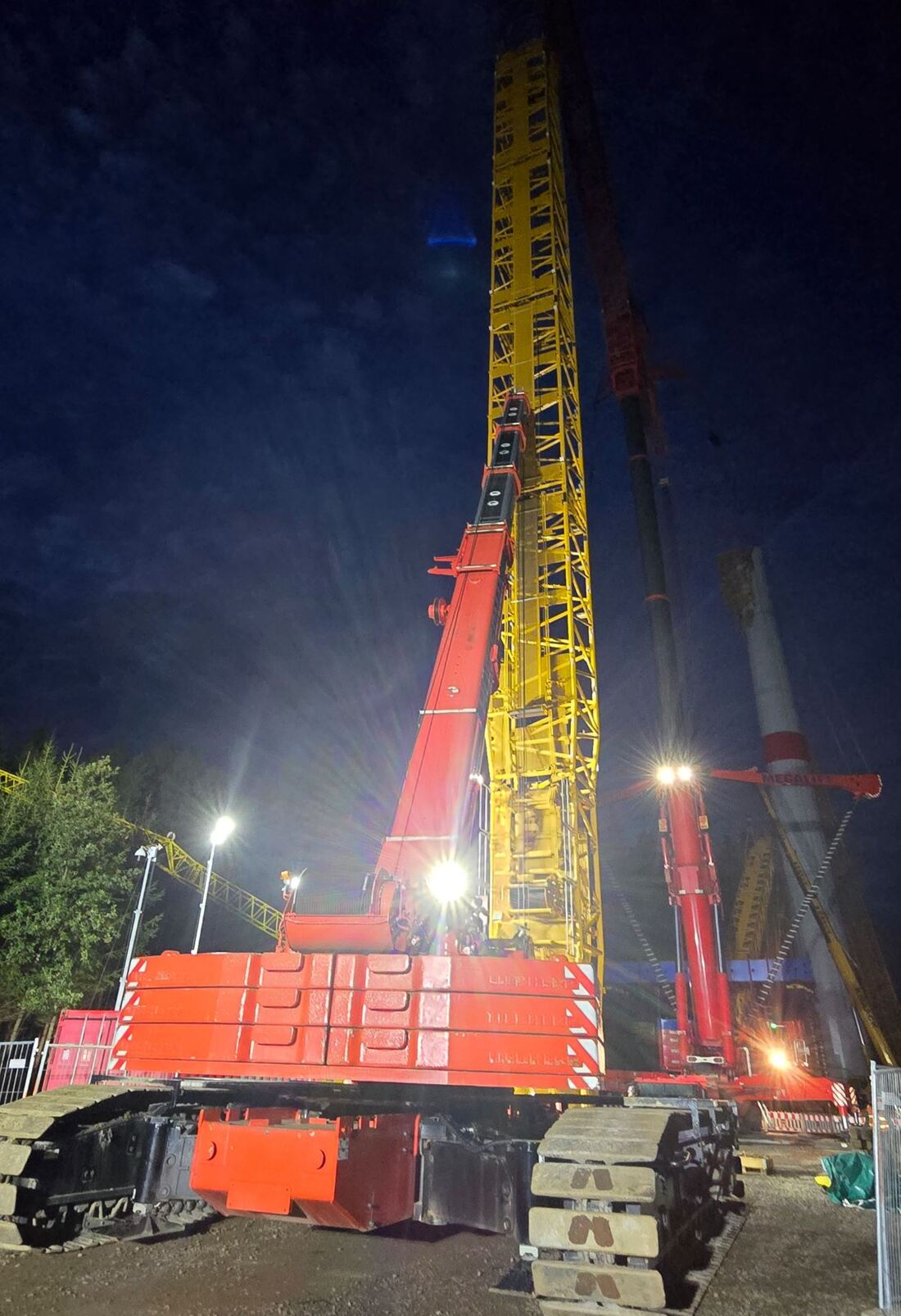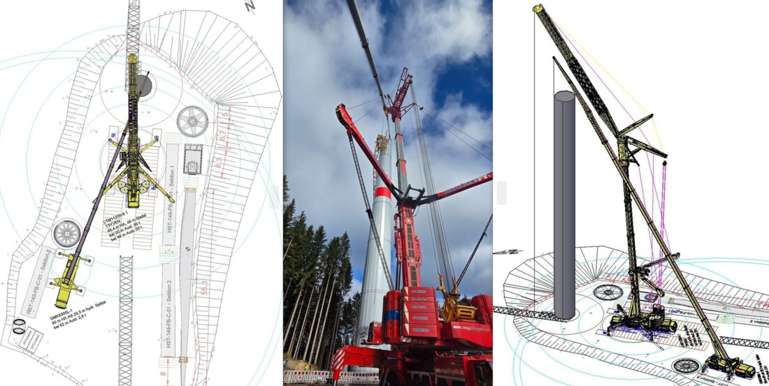 Die besondere Herausforderung: LTM 11200 und GMK 6300 mussten nahezu denselben Punkt anfahren – in einem extrem engen „Schlauch“ hinter dem Turm