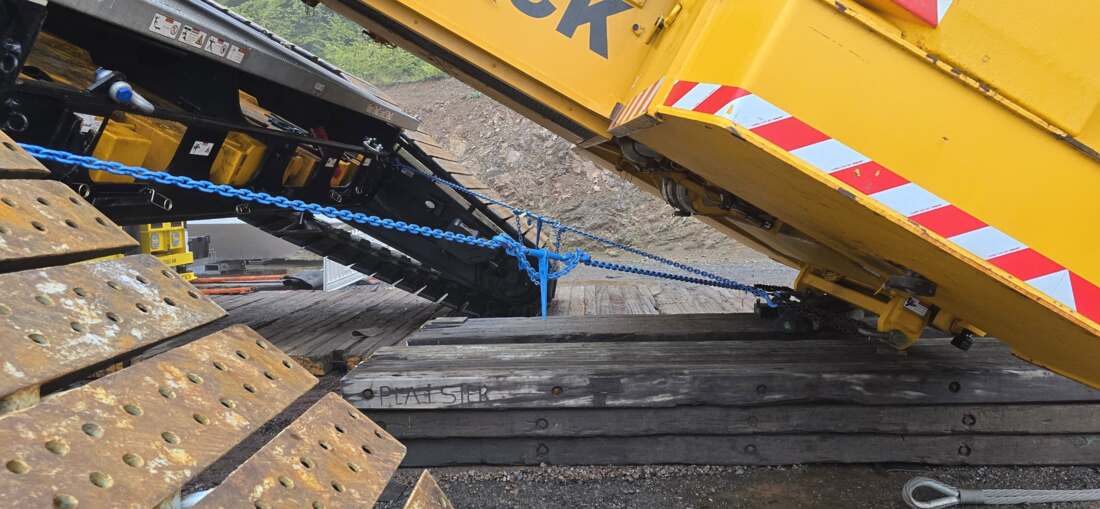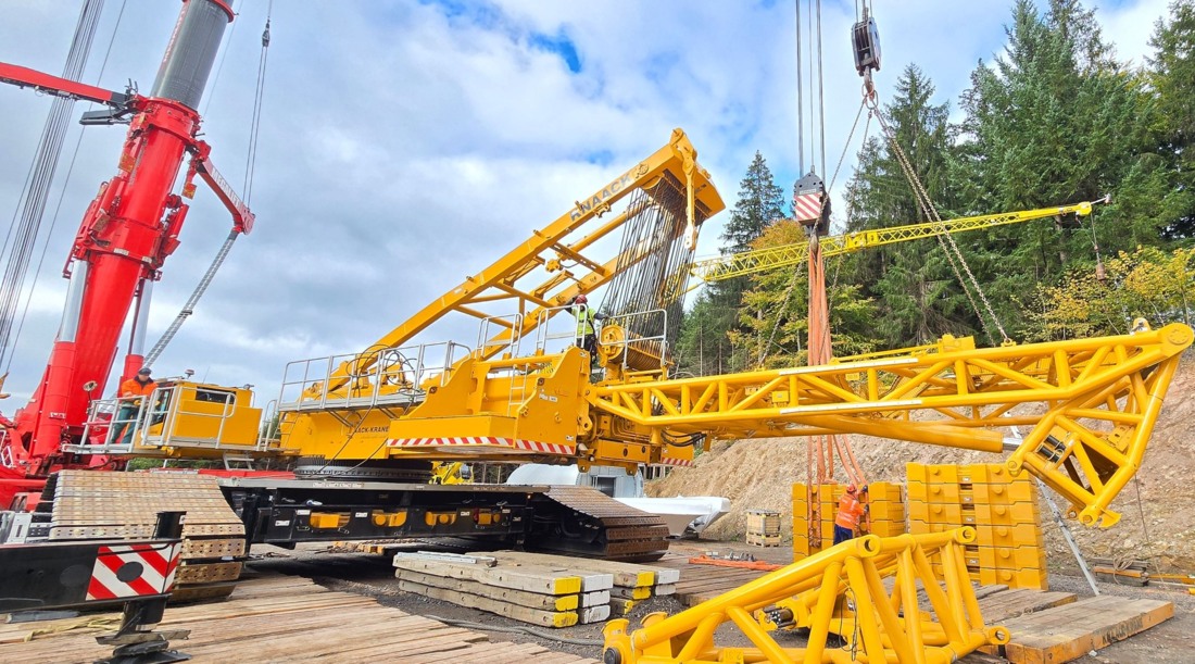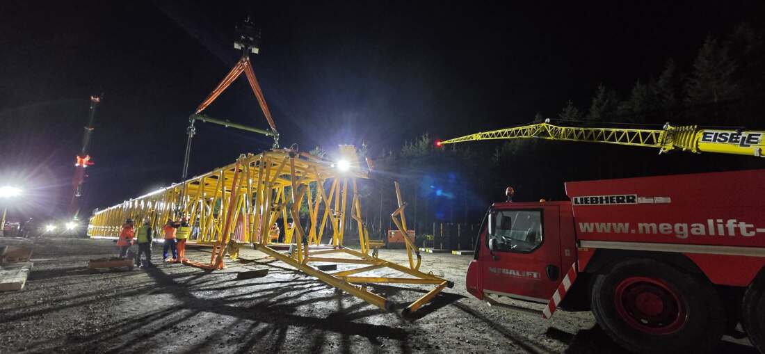 Da der Platz extrem begrenzt war, unterstützte der Geländekran LTR 1220 im Tandemhub, indem er beim Ablegen des Auslegerteils rückwärts ausfuhr. Das Auslegerstück konnte so sicher am Boden abgelegt und später demontiert werden.