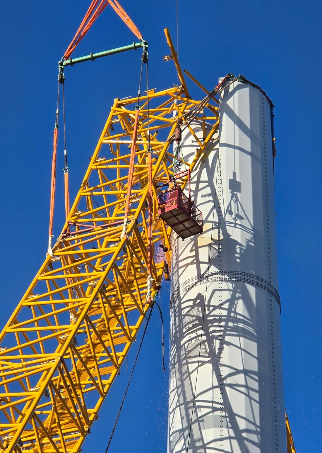 Der Derrick-Ausleger wird in eine senkrechte Position aufgerichtet, um ihn ausbolzen zu können