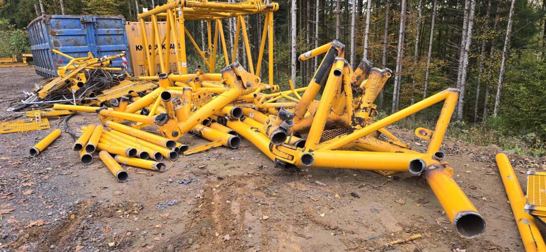 Der zweite Auslegerteil war über dem Turm abgeknickt und in den Boden gerammt; die Hilfsspitze war gebrochen und stark deformiert
