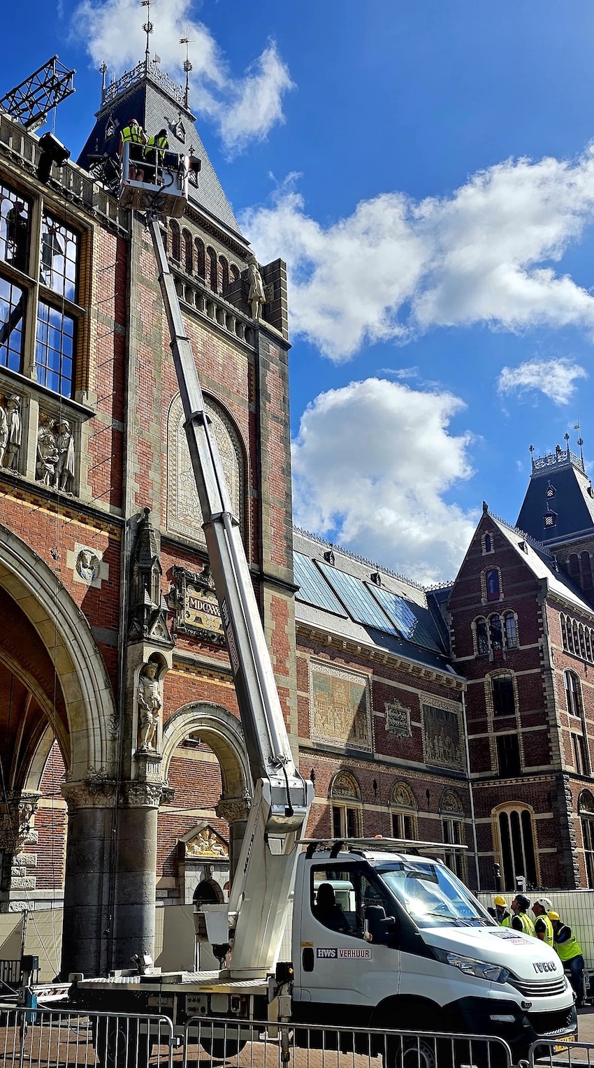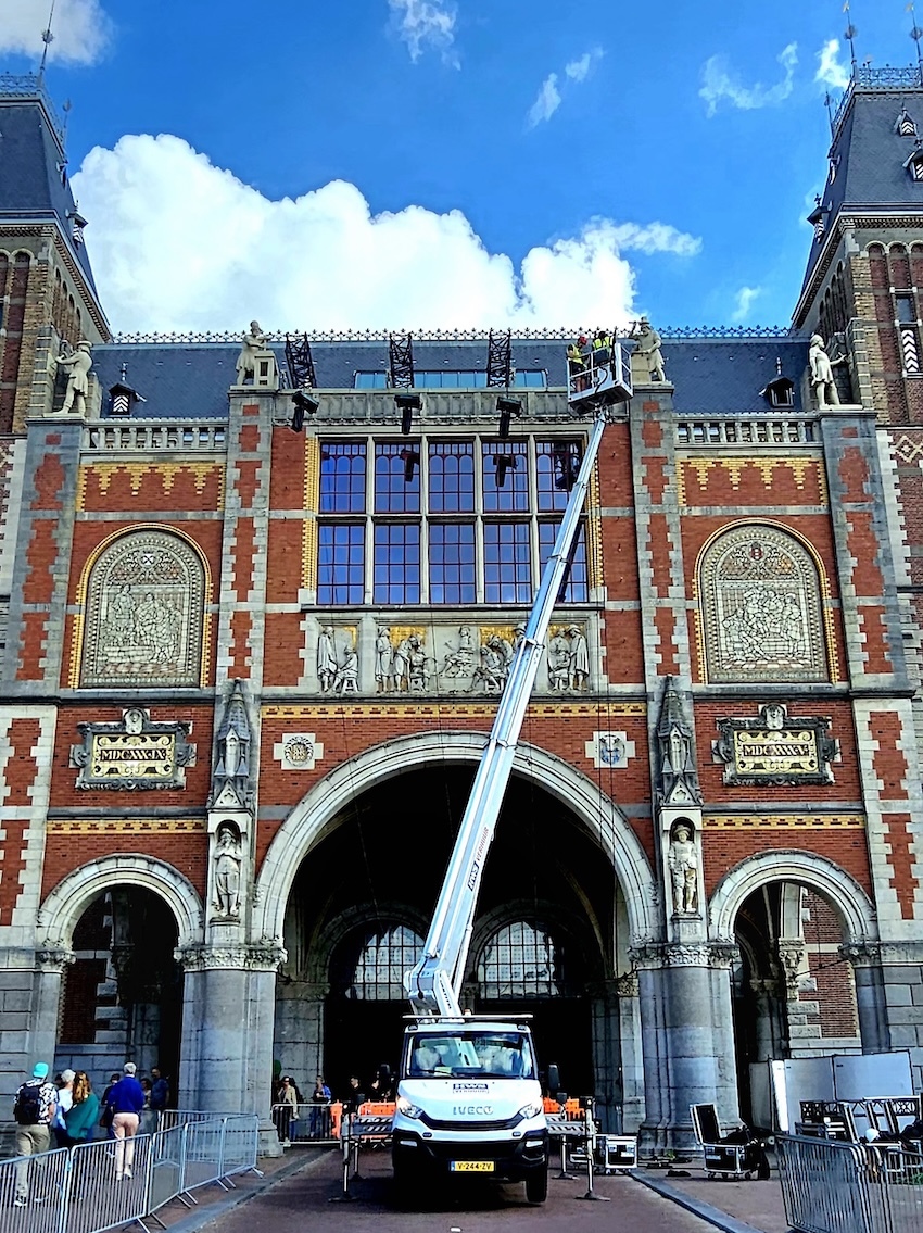 Für die Installation einer Videowand an der Hauptfassade des Rijksmuseums in Amsterdam wurde eine LKW-Arbeitsbühne vom Typ Multitel MTE 270 EX mit 27 Metern Arbeitshöhe eingesetzt. Das Museum am Museumplein beherbergt Werke von weltberühmten Künstlern wie Rembrandt, Vermeer und Van Gogh.
