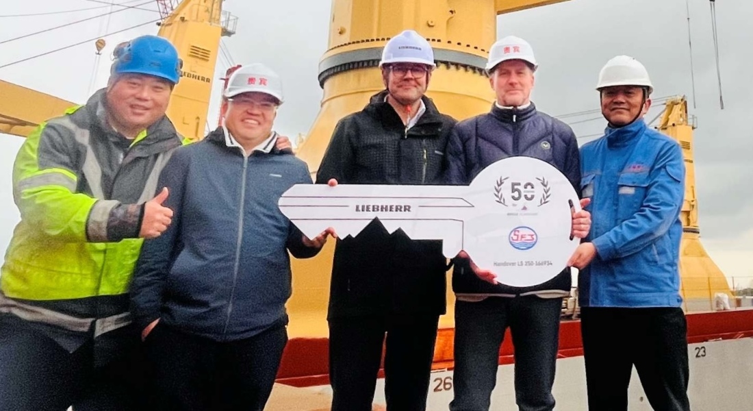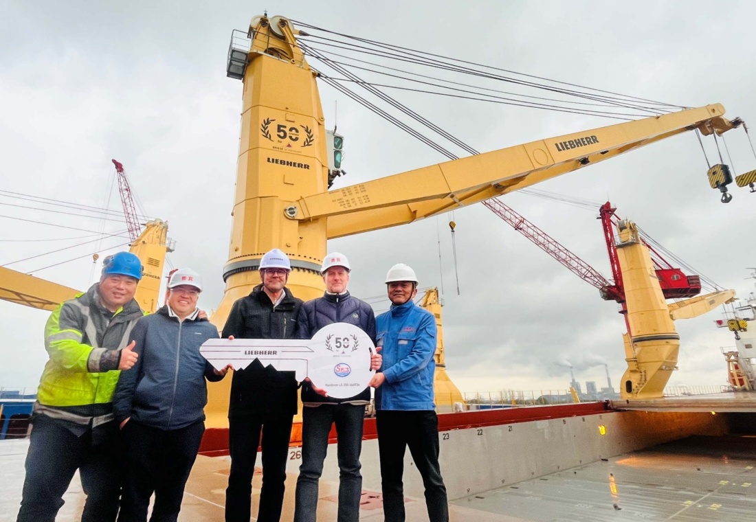 Shuangjian Yin von Liebherr Shanghai, David Lyu von Briese Schiffahrt, Richard Erhart von Liebherr Hongkong, Bernd Böning von Briese Schiffahrt und John Zhu von Taizhou Sanfu (v.l.) Robert Pitschmann, Global Application Manager für Heavy Lift Offshore und Schiffskrane bei Liebherr in Rostock, sagt: „Gemeinsam haben wir Grenzen in Design und Leistung verschoben und Krane gebaut, die den heutigen betrieblichen Anforderungen entsprechen und die Herausforderungen von morgen antizipieren.“