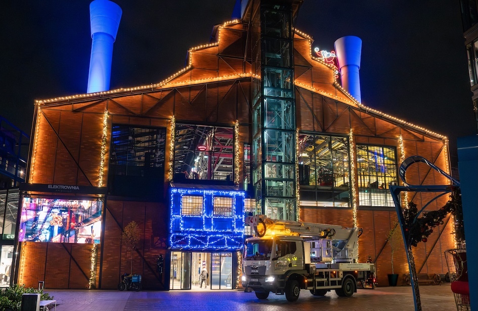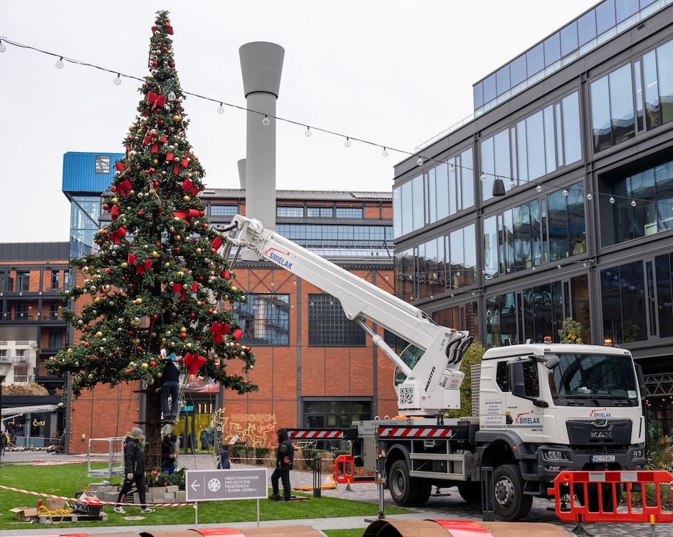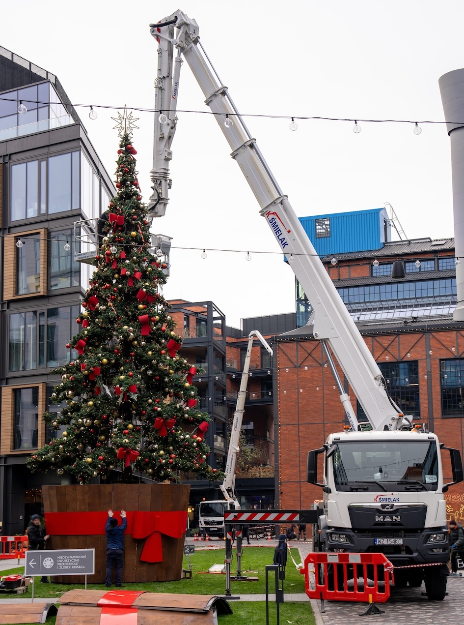 Das polnische Vermietungsunternehmen Smielak hat eine LKW-Arbeitsbühne vom Typ Multitel MJ 375 mit 37,5 Meter Arbeitshöhe eingesetzt, um Weihnachtsdekorationen anzubringen und einen Weihnachtsbaum in einem Warschauer Einkaufszentrum zu schmücken.