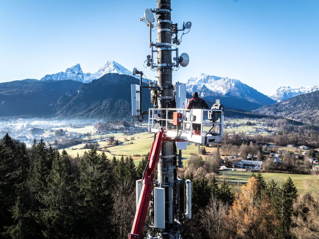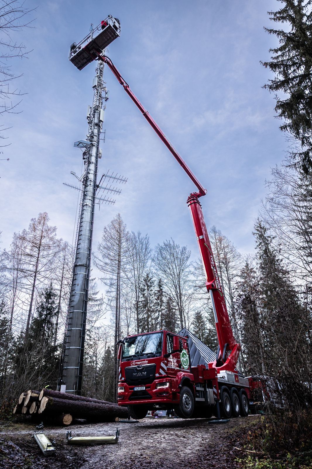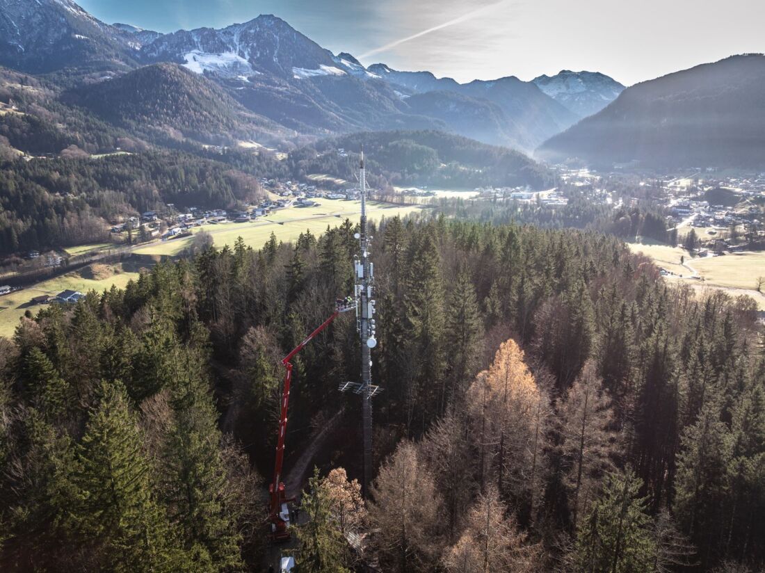 Und der fuhr natürlich gleich mal den ersten emissionsfreien Einsatz mit der Neuerwerbung. Mitten in den bayerischen Alpen, unweit des Nationalparks Berchtesgaden und mit direktem Blick auf den Watzmann, war die 57-Meter-Bühne für Arbeiten an einem Funkmast im Einsatz.