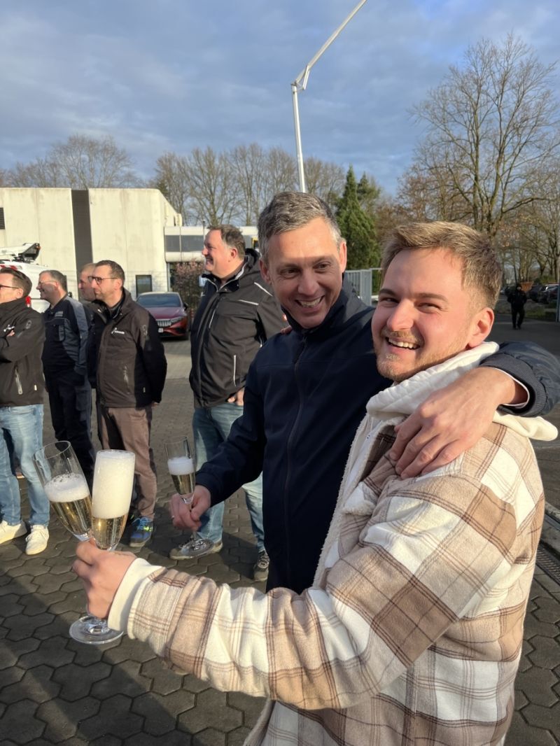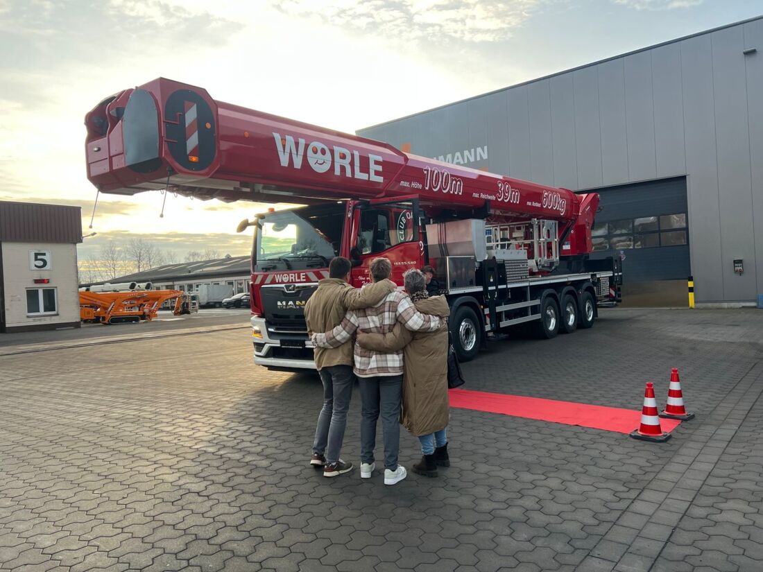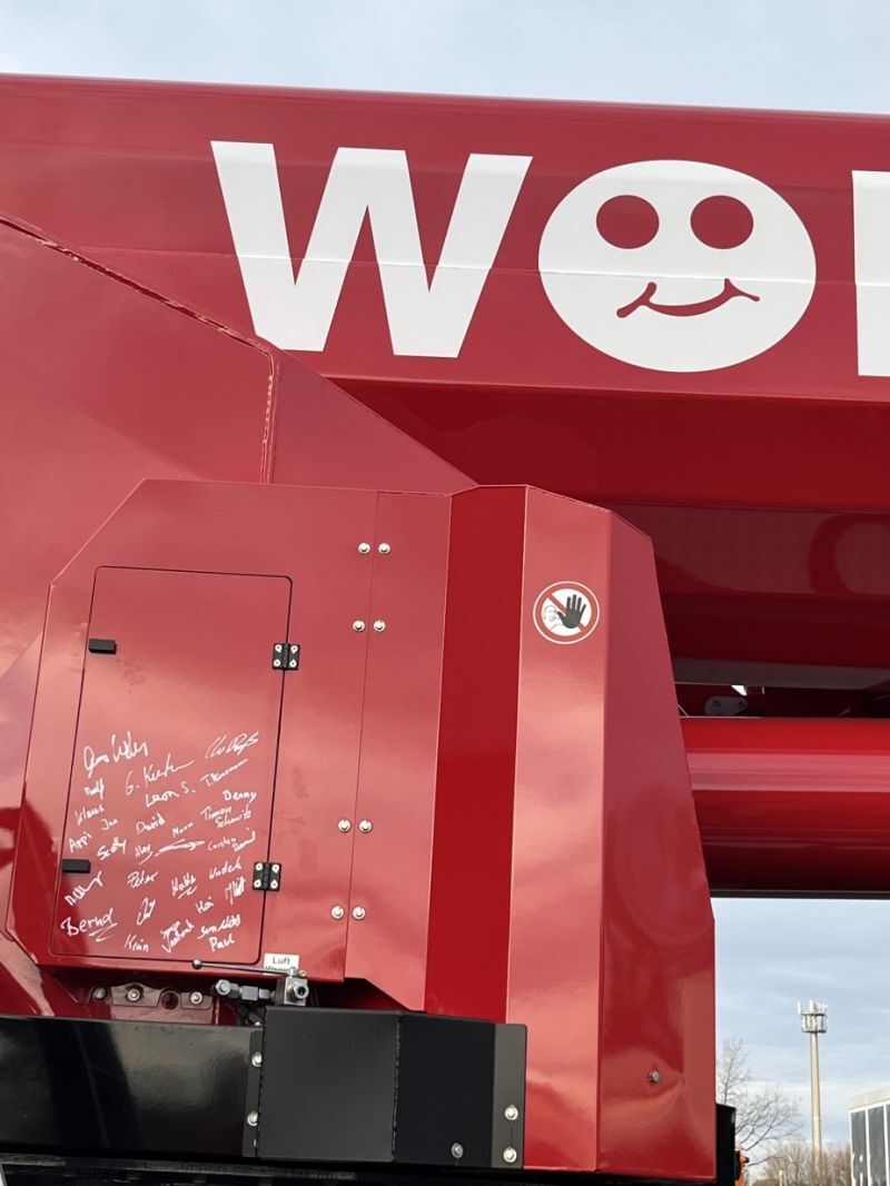 Bei der offiziellen Abholung des Fahrzeugs standen alle am Projekt beteiligten Ruthmann-Beschäftigten Spalier. Zudem signierten sie den Turm des Geräts – damit wurde der neue T1000 zu einem echten Unikat. Für Felix Wörle erfüllte sich dabei kurz vor Weihnachten ein ganz persönlicher Geburtstagswunsch: 100 Meter Arbeitshöhe.
