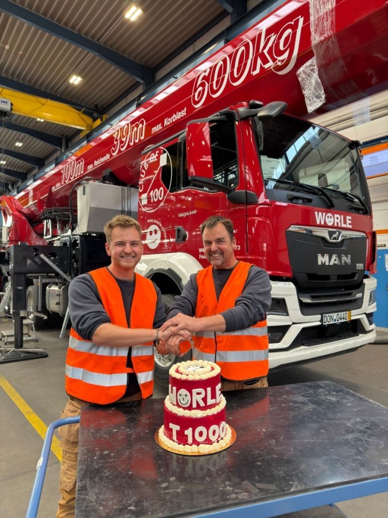 Ein erster Höhepunkt auf dem Weg zur neuen 100-Meter-LKW-Bühne war bereits die Hochzeit, also die Montage des Bühnenaufbaus auf das Trägerfahrzeug von MAN. Familie Wörle war selbstverständlich vor Ort. In diesem Moment durfte Jörg Wörle selbst Hand anlegen und den entscheidenden Bolzen einschlagen. Ganz wie bei einer echten Hochzeit fehlte auch die Torte nicht.
