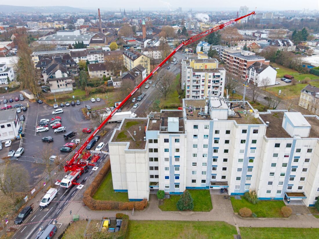 Gerade im Ausbau der digitalen Infrastruktur sieht er noch großes Potenzial. Mit seiner Kransparte und seinem Baustellen-Absperrservice ist das Unternehmen derzeit bei einem Mobilfunkprojekt in Bonn vertreten: Der momentan noch größte Gerken-Kran, ein 100-Tonner, hebt dabei aus 60 Meter Entfernung den Antennenmast auf das 21,60 Meter hohe Wohngebäude.