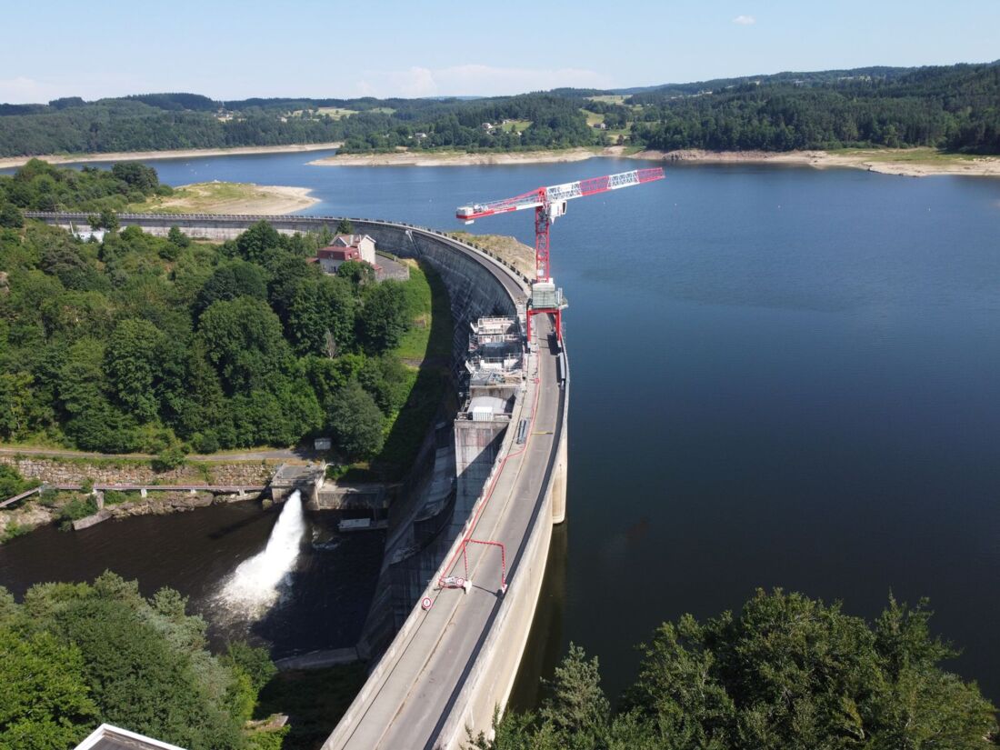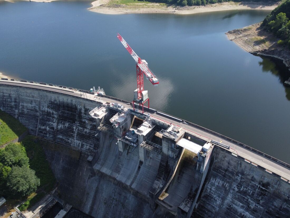 Auch ein Kran wandelt mal auf schmalem Grat. Für die grundlegende Sanierung des historischen Staudamms Barrage de Lavalette im Département Haute-Loire im Südosten Frankreichs setzt das vom Bauunternehmen Legendre Génie Civil geleitete Baukonsortium auf eine maßgeschneiderte Lösung von Wolffkran. Ein Wolff 7534.16 Clear auf einem Cityportal ist bereits seit März 2025 im Einsatz und spielt unter sehr beengten Platzverhältnissen bei dem anspruchsvollen Infrastrukturprojekt eine Schlüsselrolle.