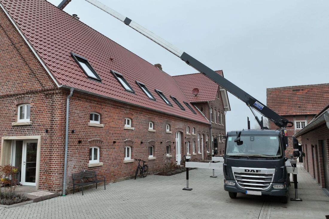 Was kann die Neuheit also? Sie erreicht eine maximale Arbeitshöhe von 32,5 Metern und erzielt mit seitlichen Reichweiten von 22 Metern (bei 300 Kilogramm Korblast) bzw. 26,50 Metern (bei 100 Kilogramm) Spitzenwerte in der 7,5-Tonnen-Kategorie. Die maximale Reichweite mit 100 Kilo Korblast liegt bei sehr satten 27,80 Meter.