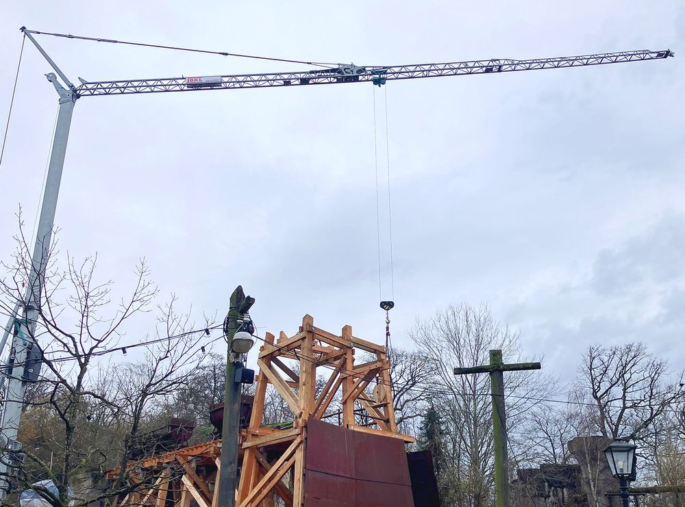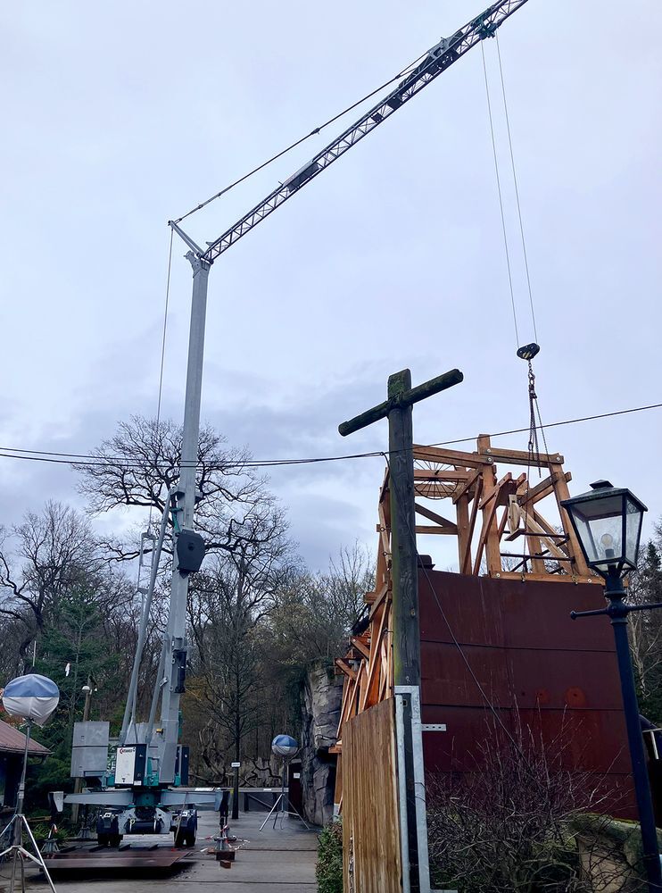 Nachdem die Eisbären für die Bauphase umgezogen waren, sollte der 14-Metertonnen-Kran möglichst untergrundschonend durch die teils verwinkelten Zuwegungen transportiert werden. Dank fest verbauter Achse manövrierte das Team den Schnellbaukran reibungslos durch das Zoogelände und montierte ihn anschließend mittels des hydraulischen Klappvorgangs schnell und sicher. Der CM 221A lässt sich mit Vollballast bereits mit einem 7,5-Tonnen-LKW transportieren – ideal für empfindliche Untergründe.