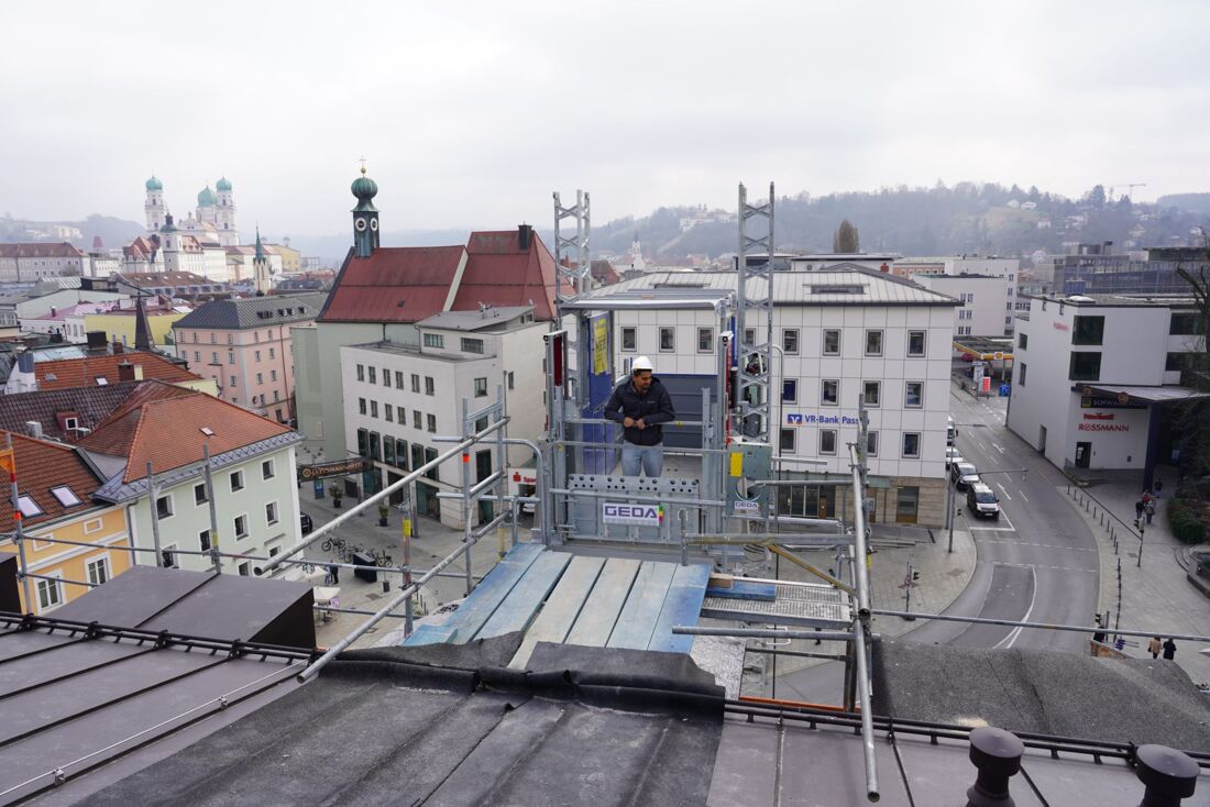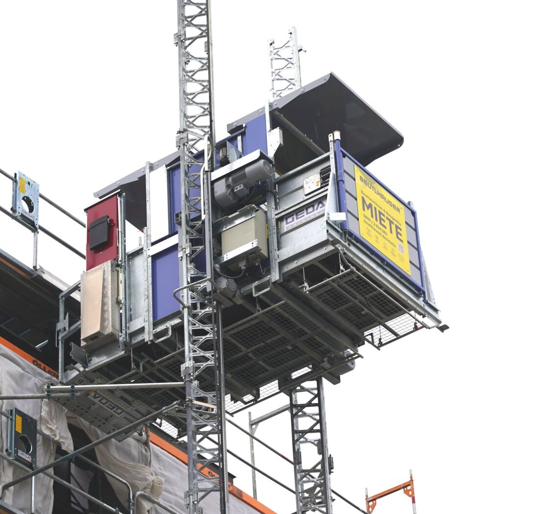 Aufgrund der innerstädtischen Baustellensituation musste ein bestehendes Baugerüst überbrückt werden. Um den Aufzug dennoch sicher zu befestigen, wurden die Masthalterungen direkt in der Betonwand verankert. Hierfür kamen drei Meter lange Gerüststangen zum Einsatz. Trotz dieser anspruchsvollen Rahmenbedingungen konnte die komplette Montage durch den Geda-Partner Beutlhauser innerhalb eines Tages abgeschlossen werden.