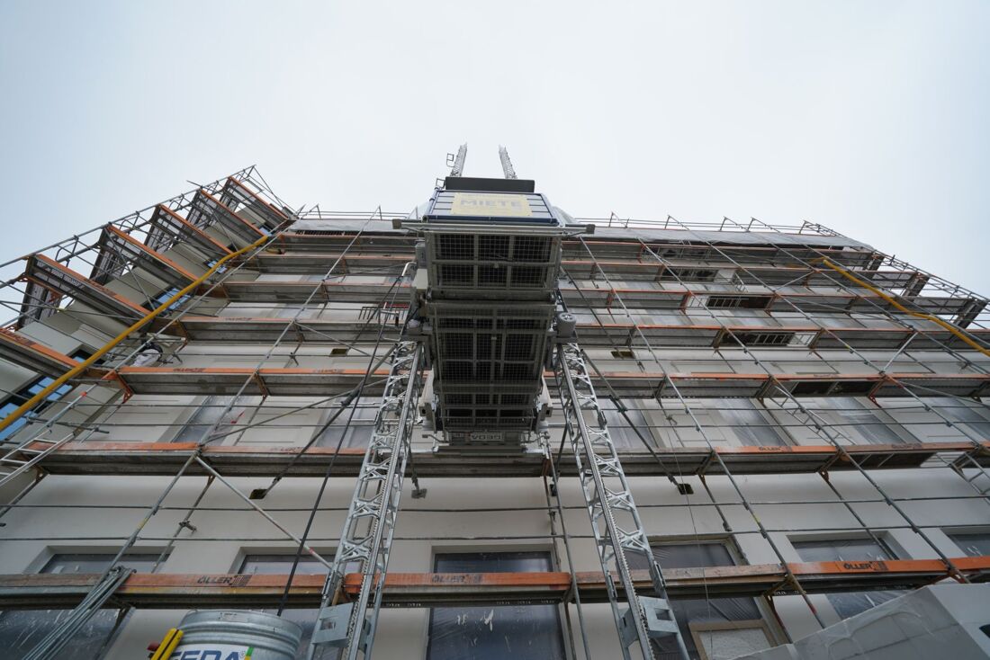 Sperrige Trockenbauwände, Waschbecken für Bad und Küche oder Paletten mit tonnenschweren Ziegelsteinen – all diese Materialien „schwebten“ während der Bauphase sicher, sauber und nahezu mühelos Stockwerk für Stockwerk bis in die fünfte Etage. Eine entscheidende Hilfe dabei war die Transportbühne Geda 1500 Z/ZP.