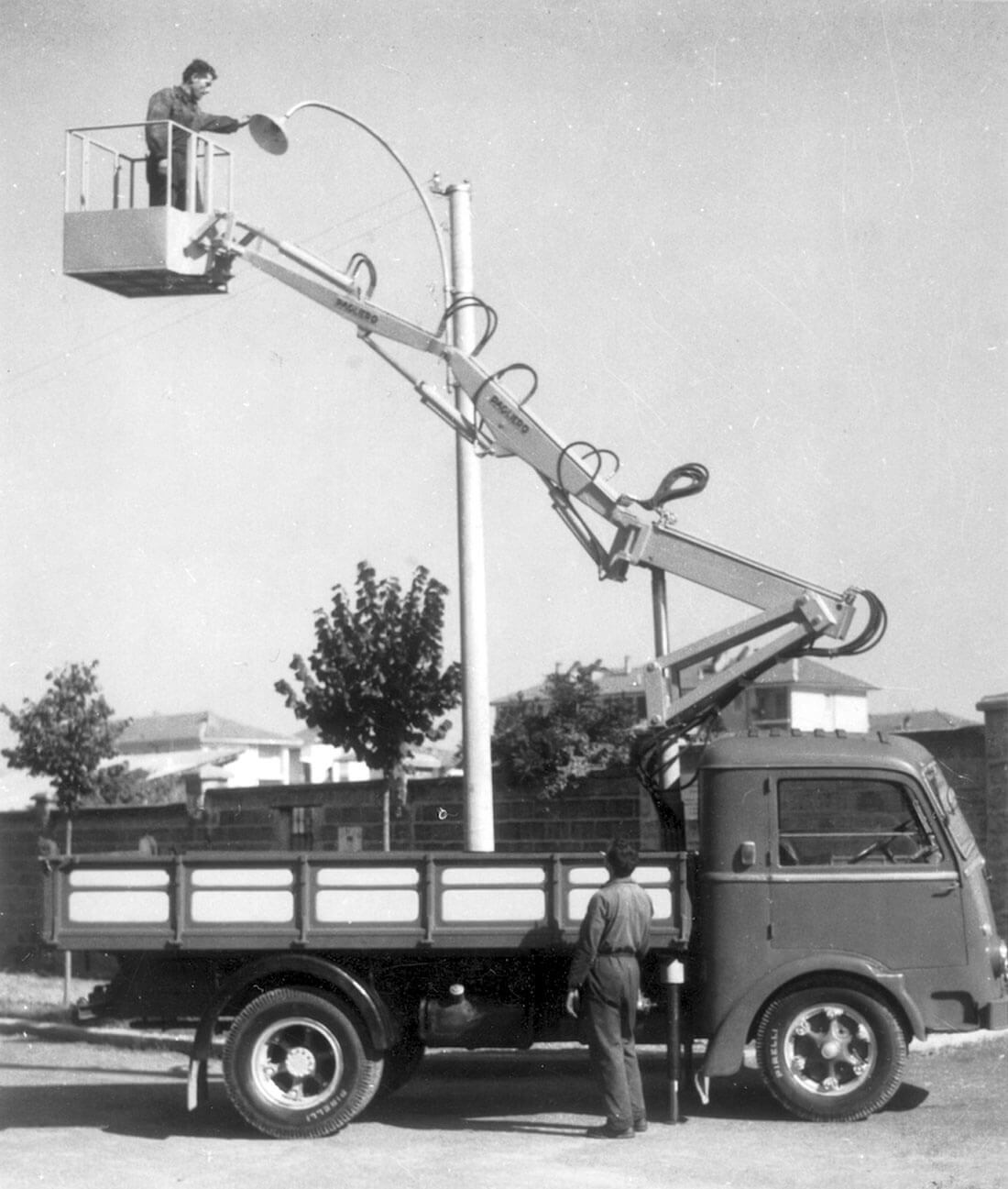1951, vor seiner Zeit: Der Einbau eines Korbs ist die natürliche Weiterentwicklung der Erfahrungen, die im Bereich der LKW-Krane gesammelt worden waren. So entsteht die erste LKW-Arbeitsbühne, zusammen mit einem neuen Markt, der später zum Kerngeschäft des Unternehmens werden sollte