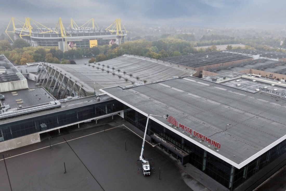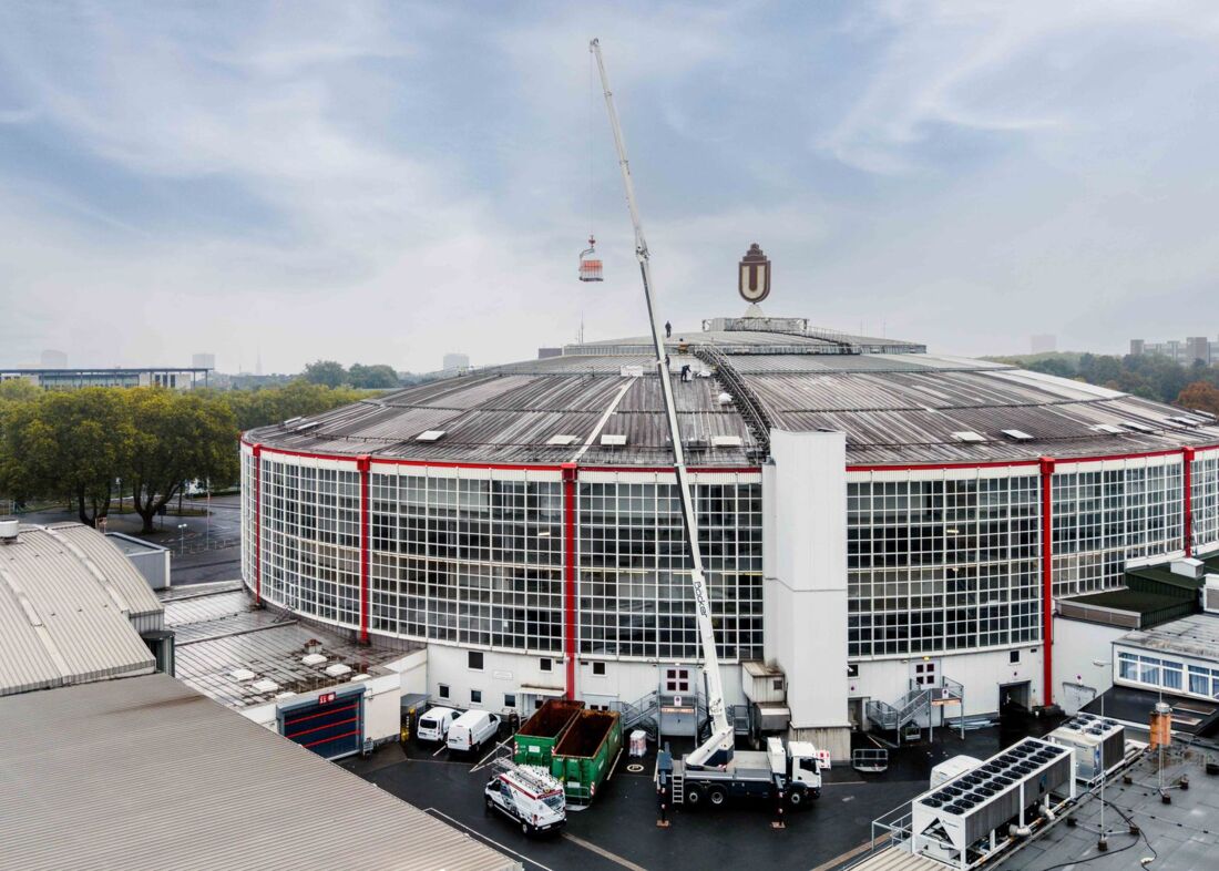 Die Westfalenhalle, bekannt für ihre markante Kuppelkonstruktion, wird zur Zeit abschnittsweise saniert. Bereits 2024 setzten Dirk Sindermann und sein Team eine Teilfläche instand, die bei einem Sturm an Heiligabend beschädigt worden war. Nun stand die vollständige Erneuerung der Deckung des oberen Rings unterhalb der Kuppel an. Die Firma Sindermann koordiniert die Arbeiten und nutzt dabei die Gelegenheit, die Neuheiten im Praxiseinsatz zu testen.
