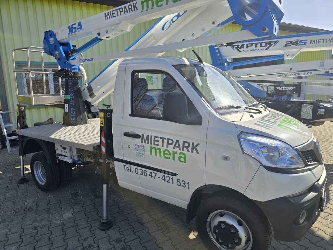 Die Wahl fiel zum einen auf eine kleine LKW-Arbeitsbühne mit der Typenbezeichnung 16A auf Piaggio Porter. Sie bietet 16 Meter Arbeitshöhe und knapp 10 Meter seitlicher Reichweite bei nur fahrzeugbreiter Abstützung und empfiehlt sich damit als Topgerät für beengte Platzverhältnisse. Da das Fahrzeug nur unter zwei Meter breit ist und ein maximal zulässiges Gesamtgewicht von 2,8 Tonnen aufweist, dürfen mit ihr selbst einfahrtbeschränkte Wege häufig passiert werden.