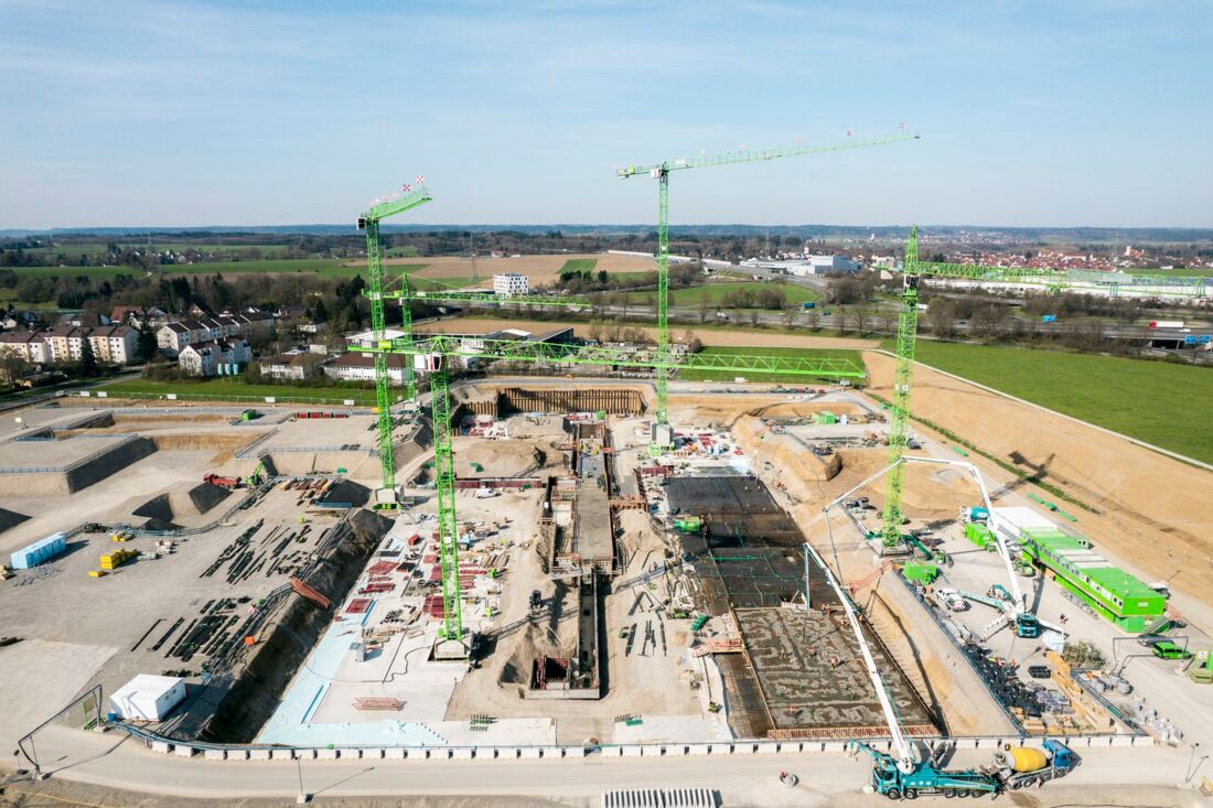Grüner wird‘s nicht: Fünf von sechs „Wölffen“ sind aktuell auf der Memminger Baustelle dafür verantwortlich, 60.000 Kubikmeter Beton und 10.000 Tonnen Stahl umzuschlagen, und zwar bis Ende 2026