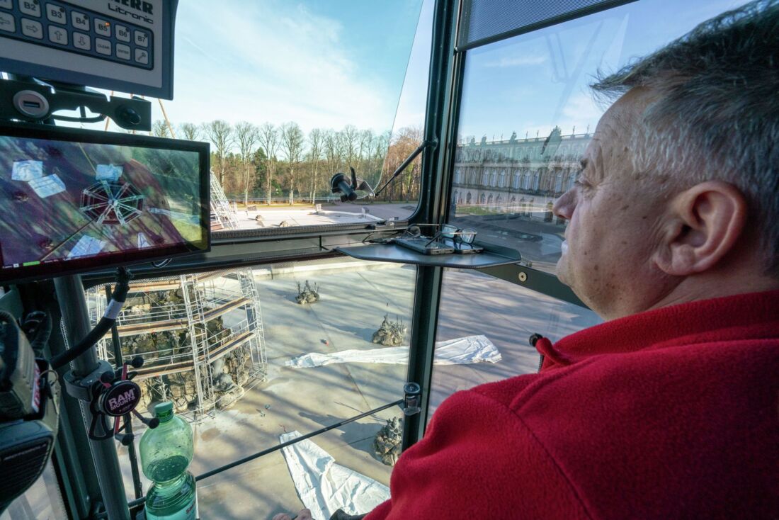 Für das präzise Positionieren der Lasten erwies sich die hochgefahrene Kabine des MK 88-4.1E als besonders hilfreich. Aus rund 20 Metern Höhe hatte Kranfahrer Drago beste Sicht auf die arbeitenden Gerüstbauer – und zugleich auf die prächtige Fassade von Schloss Herrenchiemsee. Zusätzlich unterstützte ihn die an der Laufkatze befestigte Hakenkamera, die den senkrechten Blick auf Hakenflasche und Last direkt auf den Monitor in der Kabine übertrug. So konnten die Bauteile zentimetergenau nach den Anweisungen der Monteure geführt werden.
