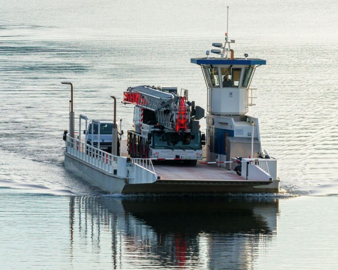 Bereits lange vor Sonnenaufgang ist der Liebherr MK 88-4.1E von BKL am Chiemsee eingetroffen, um mit der ersten Fahrt der Lastenfähre auf die Herreninsel übergesetzt zu werden. Dort ging es direkt zum Schloss Herrenchiemsee, einst errichtet vom bayerischen Regenten Ludwig II.