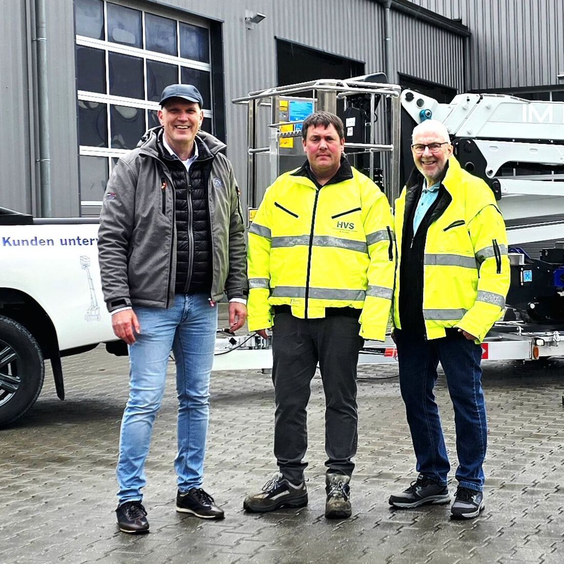 Bernhard Kahn mit Markus und Frieder Sturhahn (v.l.) HVS-Arbeitsbühnen mit Sitz in Steinhagen bei Bielefeld ist ein erfahrener Anbieter im Bereich der Vermietung von Arbeitsbühnen. Dieses Jahr feiert der 1996 von Friedel Sturhahn gegründete Betrieb seinen 30. Geburtstag. Der Gründer startete damals zunächst allein, dann mit einem Mitarbeiter – und gerade mal zwölf Arbeitsbühnen. Mittlerweile beschäftigt HVS neun Mitarbeiter und betreibt einen umfangreichen Mietpark aus LKW- und Scherenbühnen, Boomliften sowie Gabel- und Telestaplern.