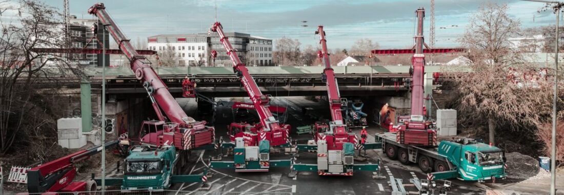 Die Hallenmeister haben jeweils 10 Tonnen gehoben und die beiden ACs 10 Tonnen gemeinsam im Tandemhub. Die Wahl fiel auf die Hallenmeister, weil über den Bahnschienen eine elektrische Oberleitung verlief, also besonders niedrig gearbeitet werden musste. Die Citykrane kamen hinzu, weil die Platzverhältnisse insgesamt sehr eng waren, so das Vermietunternehmen.