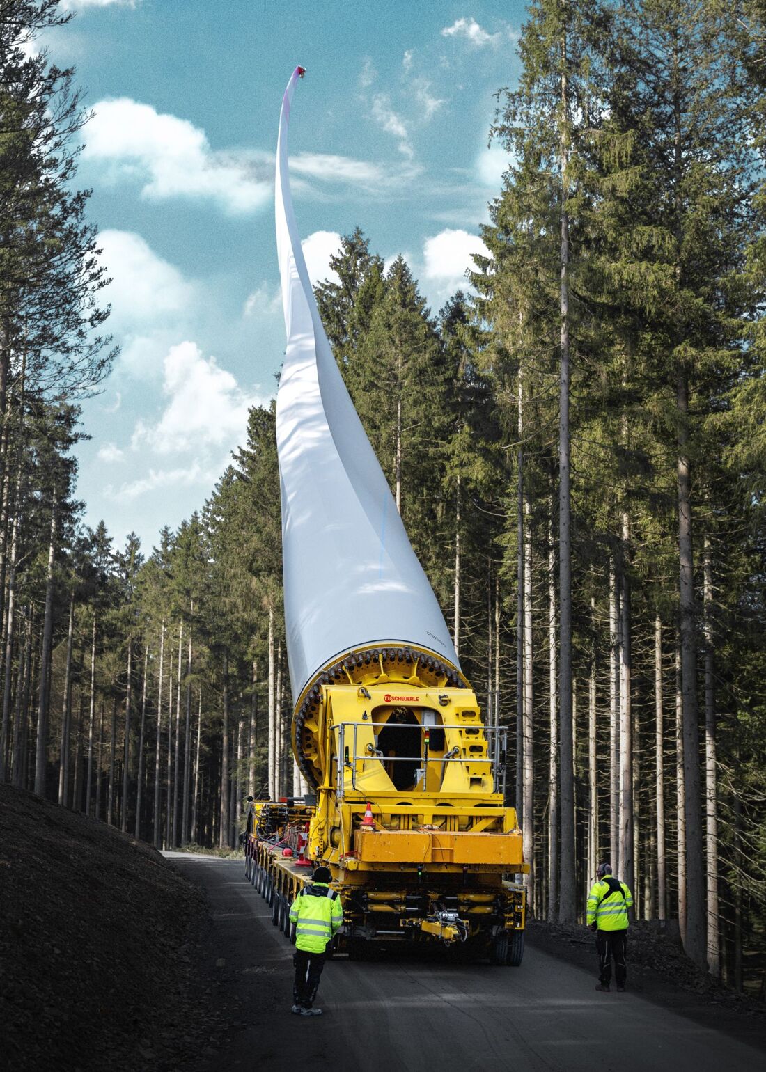Steil stellt steil: Vorteil des Bladelifters: Durch das gezielte Anheben der Rotorblätter können Hindernisse wie Bäume überwunden werden. Die Transporte erfolgen sowohl tagsüber als auch in Nachtfahrten.