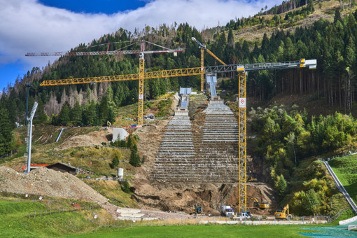 Eine Anhängerarbeitsbühne des Typs Denka DL 25 – leicht und mit 25 Metern Arbeitshöhe – unterstützte das Bauteam an der Rückseite des Stadions. Aufgrund der eingeschränkten Tragfähigkeit des Untergrunds durfte ihr Gewicht nicht allzu hoch sein: Lediglich 2,5 Tonnen bringt sie auf die Waage.