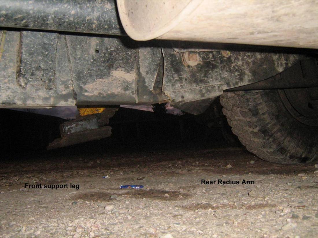 Underneath the vehicle with the front support to the left and rear radius arm in front of the wheel.