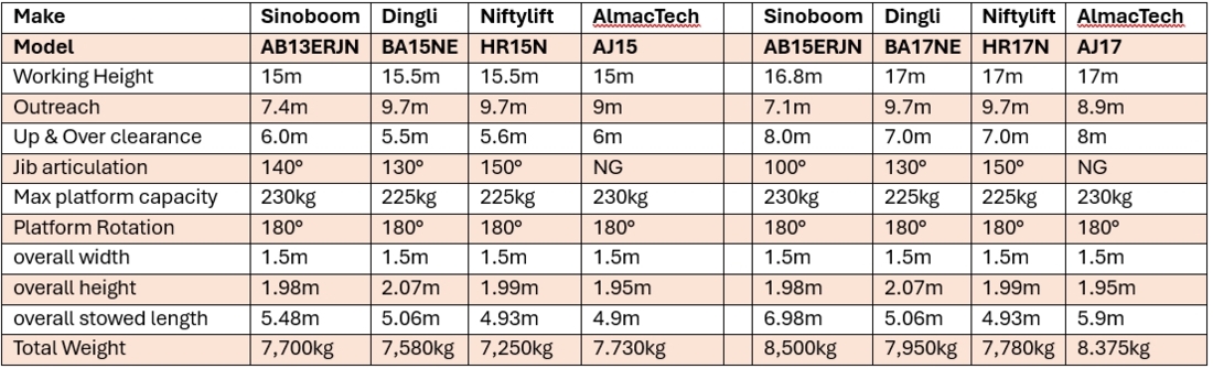 Both models employ dual risers and a two section telescopic boom topped by an articulating jib with optional 130 degrees lateral rotation, for working heights of 15 and 17 metres, with an up & over clearance of six and eight metres respectively. Maximum outreach on both is around nine metres - a few millimetres less on the AJ17 - with the unrestricted maximum platform capacity of 230kg. The key difference between the two machines being the slightly longer risers on the AJ17.