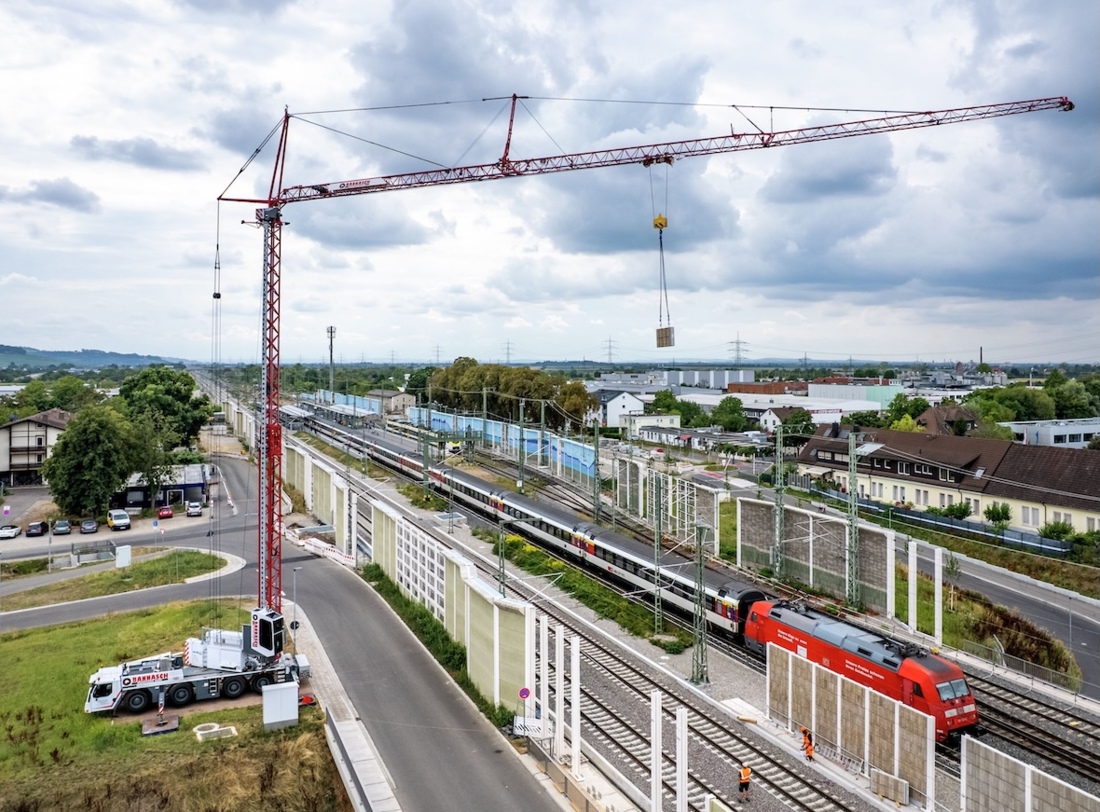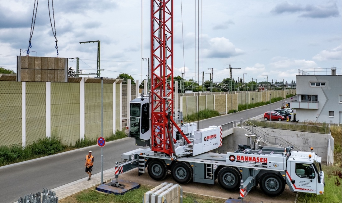 German contractor Arthur Bannasch Transporte has taken deliery of a second Liebherr MK 88-4.1E mobile self erecting tower crane and used it to install noise barriers on the Rhine Valley railway line between Karlsruhe in Germany and Basel in Switzerland alongside a live railway.