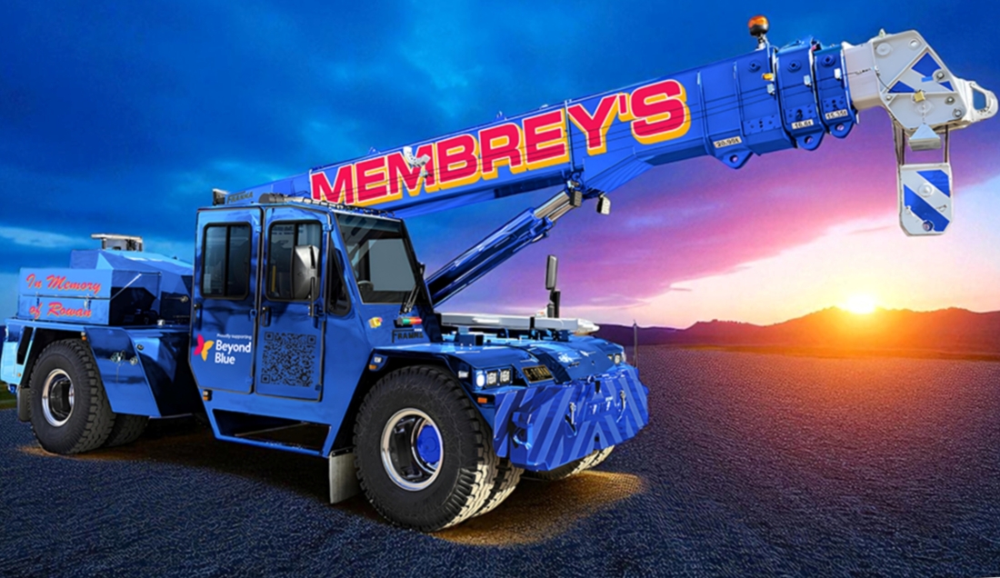 The Mac 25 was purchased by Membrey's in memory of Rowan, son of Craig Membrey, whose lift ended in suicide in 2011. The crane's Beyond Blue blue livery includes a QR code linked to a fundraiser page.