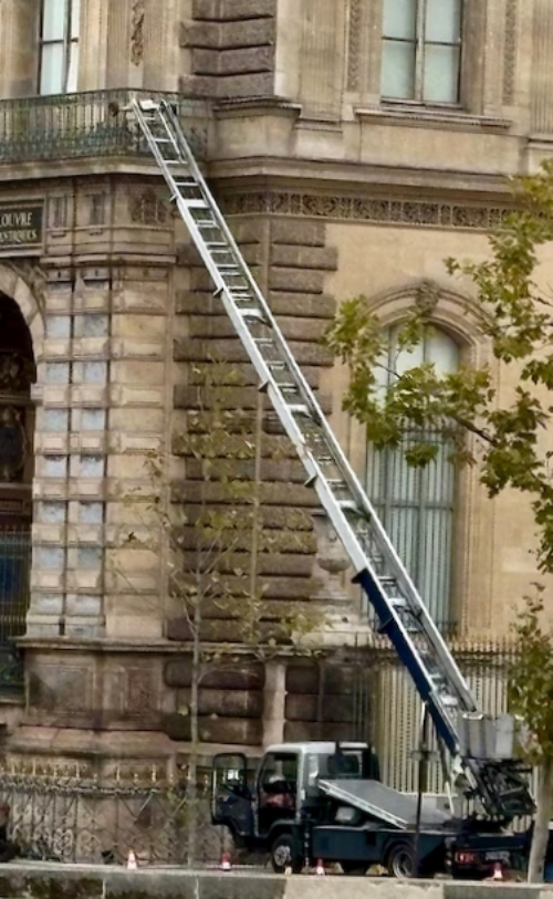 The entire raid only lasted seven minutes -our guess is that they scaled the ladder mast, rather that trundled up in the load platform. They all got away, although they did drop a diamond and emerald crown of the Empress Eugénie as they fled on motorbikes.