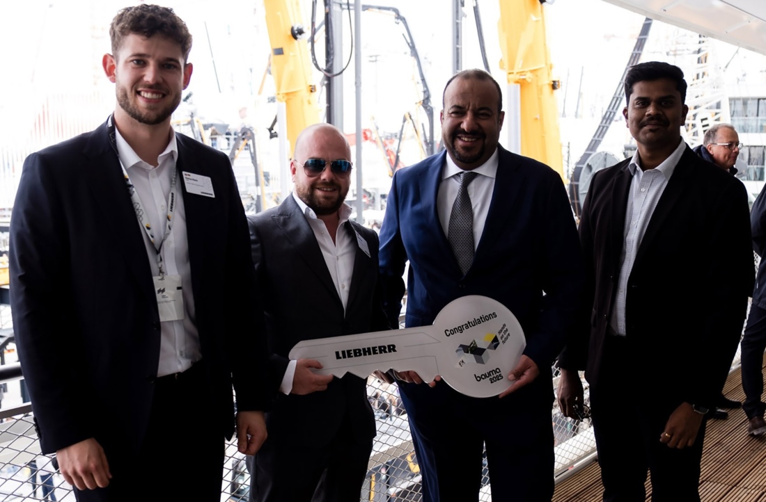 The handover (L-R) Marius Kleck and Silvio Rützler of Liebherr with Mohamed Bucheeri and Maran Rajangam of MMETC