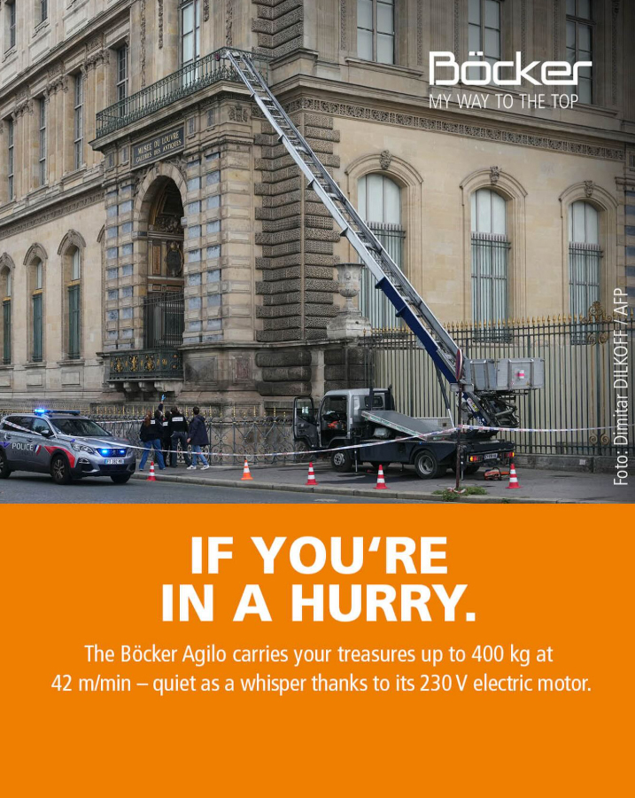 German crane and platform manufacturer Böcker has acted quickly and created an advert for its Agilo platform, cleverly making the most of this week’s news, regarding the Louvre break in which two men stole €88 million worth of jewels in around seven minutes start to finish. They managed it – of course – by using a Böcker furniture hoist. The ad speaks further.