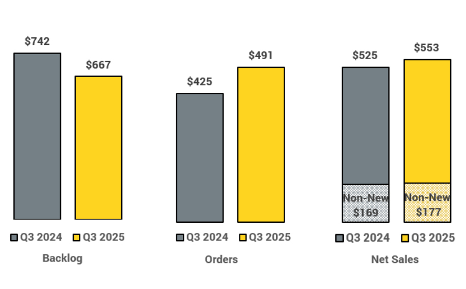 Third quarter sales comparison Chief executive Aaron Ravenscroft said: “Manitowoc delivered solid third quarter results driven by favourable product mix, strong execution by our MGX distribution business, continued growth in our non new machine sales, and actions to offset tariffs, all the while battling softness in crane demand in the Americas caused by ongoing U.S. tariff pressures.”