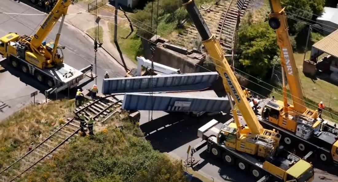 Three All Terrain Cranes were brought in from local companies to remove the fallen bridge, a five axle unit from Henry Plant & Equipment along with a four and a five axle crane from Central. The bridge was lifted onto trucks and transported away, leaving the truck mount free for the investigators to do their thing.