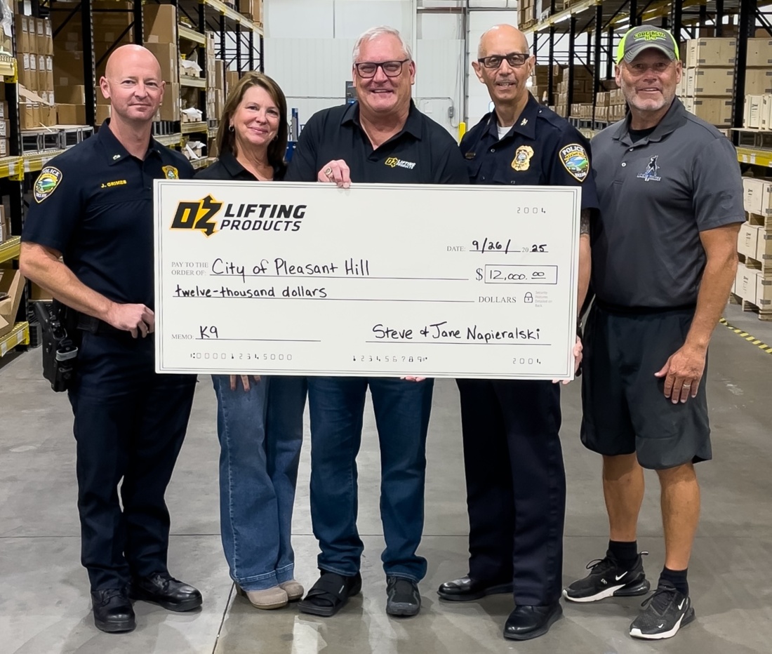 Handing over the $ 12,000 cheque - (L-R) lieutenant Grimes of Pleasant Hill Police with Steve and Jane Napieralski of OZ Lifting along with chief Pizzano and Trace Erickson