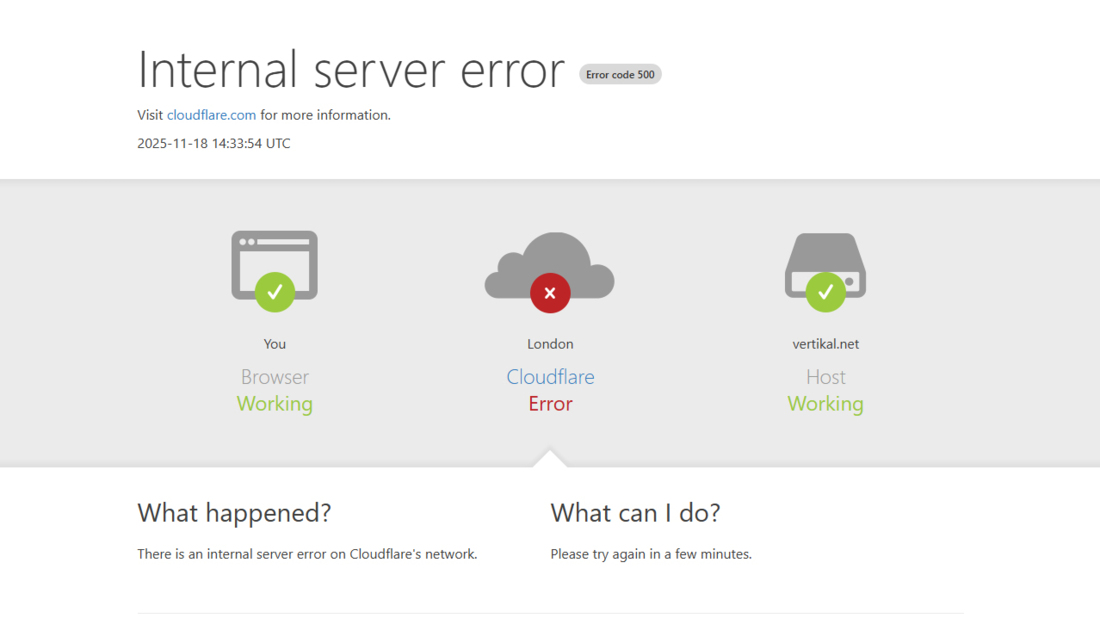A large number of major websites and portals were affected today by an issue with Cloudflare servers, including Twitter/ X, Spotify, OpenAI, Amazon Web Services and Vertikal.net. All went off air along with many others intermittently at times, with more than an hour’s break at one point.