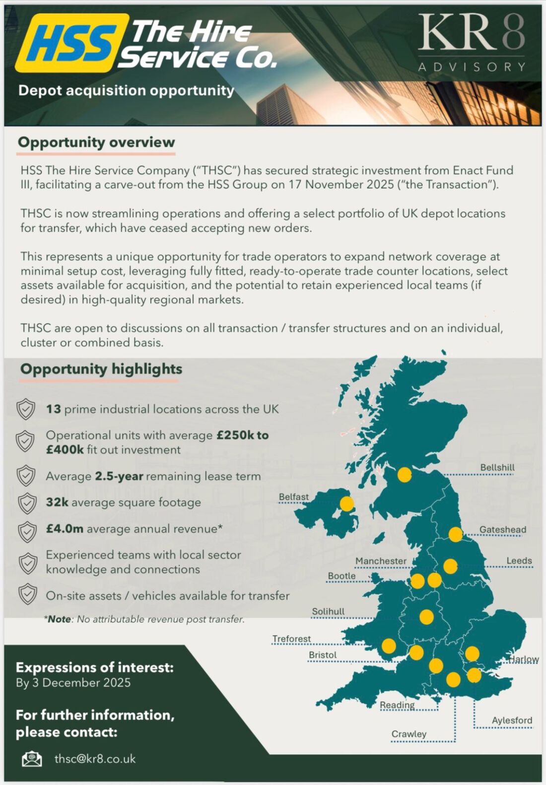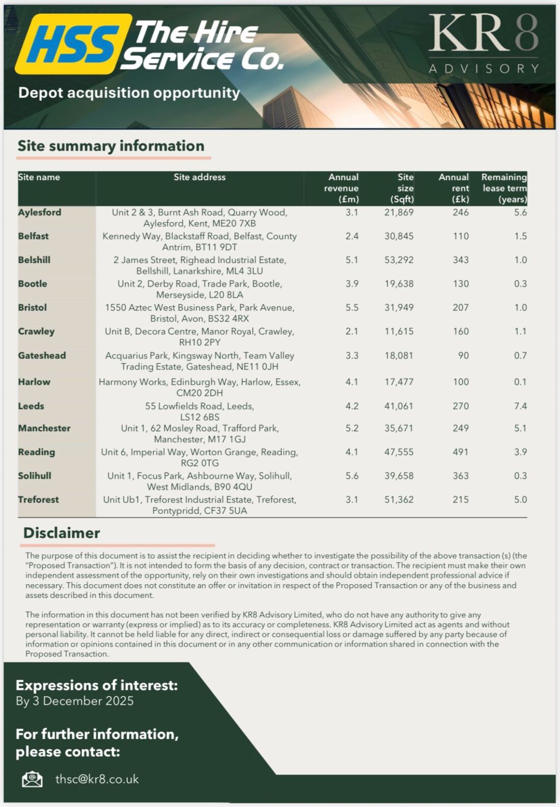 “KR8 Advisory is pleased to be bringing to market a unique opportunity arising from the recent carve out of HSS into The Hire Service Company, a select portfolio of fully fitted, ready-to-operate depot sites across the UK. Please get in touch if you would like to discuss anything with the team.”