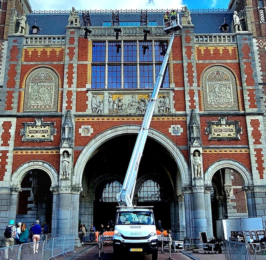 A 27 metre Multitel MTE 270 EX truck mounted platform has been used in the installation of a video wall on the main façade of the famous Rijksmuseum in Amsterdam. The museum, located in the Museumplein, houses works by Rembrandt, Vermeer, and Van Gogh to name a few.