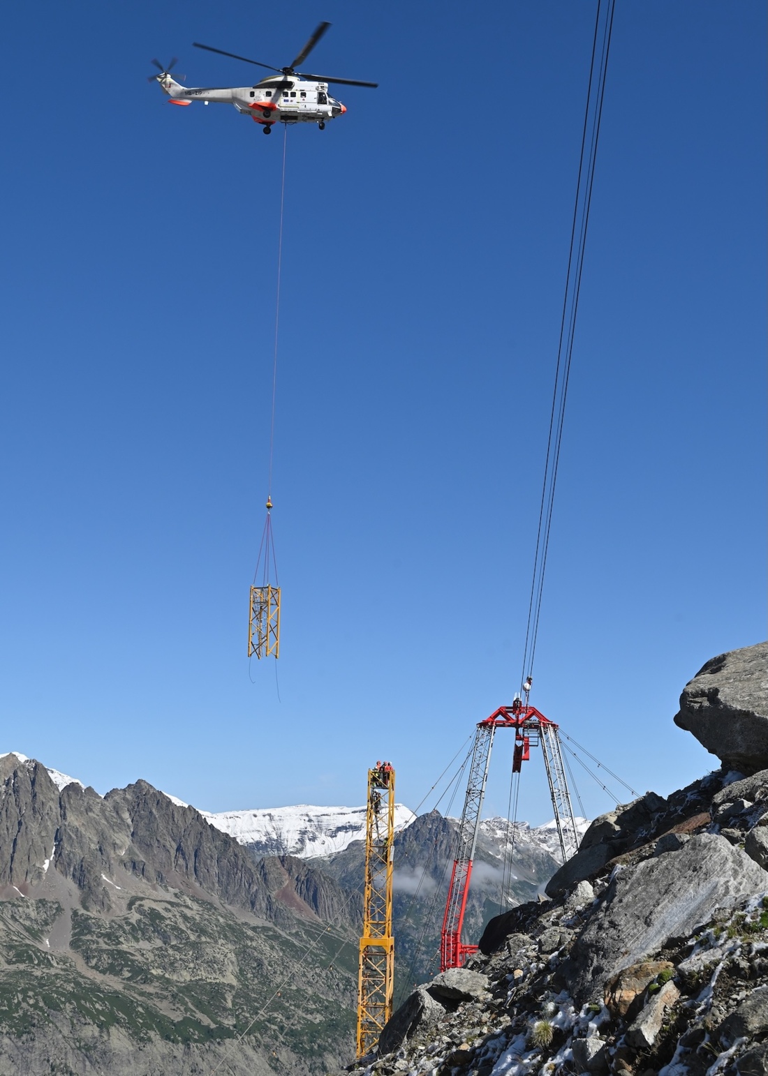 A cable car that travels to 3,300 metres was used to transport materials for pylon installation and some crane components, reducing the number of helicopter lifts required.