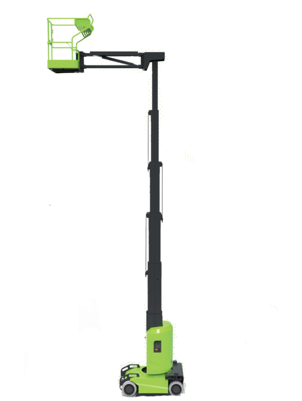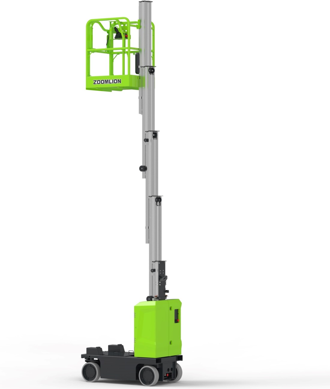 The ZMP06G uses a flat profile five section aluminium mast for an eight metre working height, a maximum platform capacity of 160kg in the 860mm long platform, which is equipped with a 500mm roll-out deck extension for a 1.36 metre by 760mm wide extended platform. The lift has an overall width of 800mm, an overall length of 1.45 metres, and a stowed height of 1.99 metres. The fully equipped machine weighs 980kg.